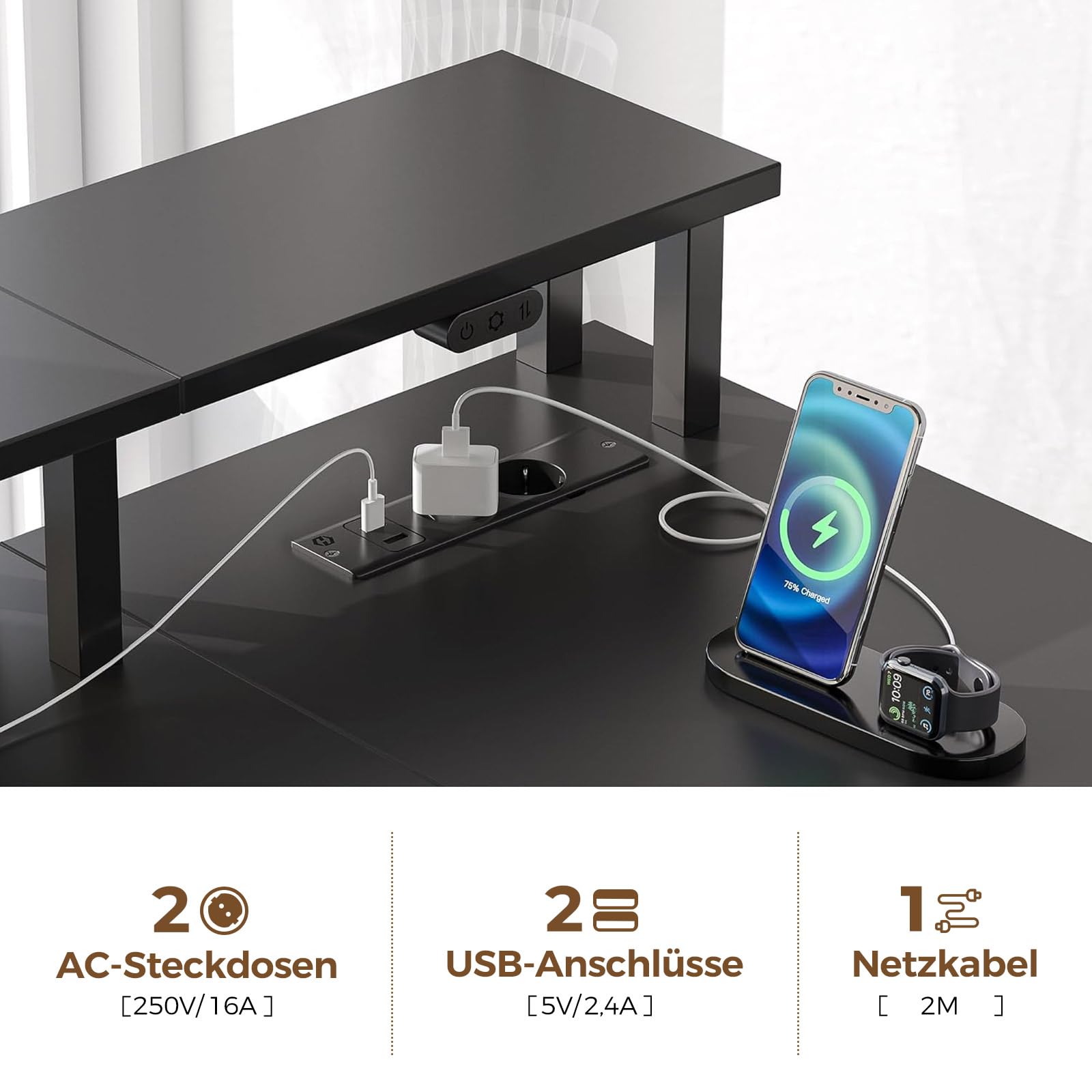 Die eingebaute Stromleiste verfügt über 2 Standard-Steckdosen und 2 USB-Anschlüsse. Damit können Sie bequem Ihren Laptop, Monitor, Ihr Smartphone und andere Geräte direkt am Arbeitsplatz mit Strom versorgen und aufladen, ohne zusätzliche Verlängerungskabel zu benötigen.