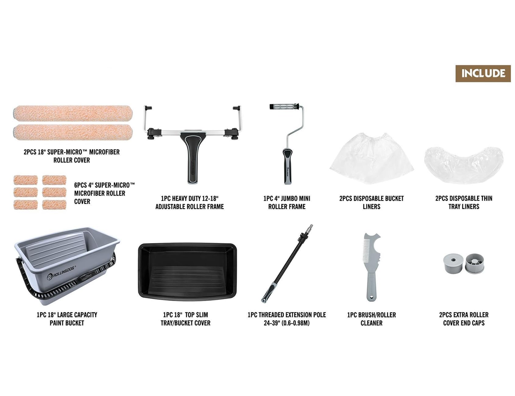 Das Set ist eine Komplettlösung und beinhaltet: einen 45,7 cm Farbrollerrahmen mit zwei Mikrofaser-Hülsen, einen 10,2 cm Mini-Walzenrahmen mit sechs Hülsen, eine Teleskopstange (0,6 - 0,98 m), einen grossen Farbeimer mit Einlagen und ein multifunktionales Reinigungswerkzeug.