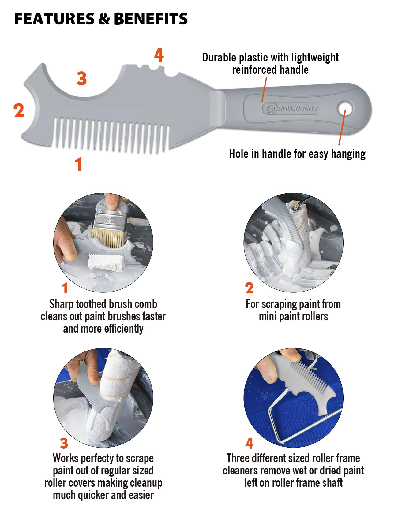 - Multifunktionale Reinigung: Ein spezielles Reinigungswerkzeug mit Kunststoffklingen und Kammzähnen entfernt Farbreste schonend von Walzen und gründlich aus Pinseln, ohne das Material zu beschädigen.