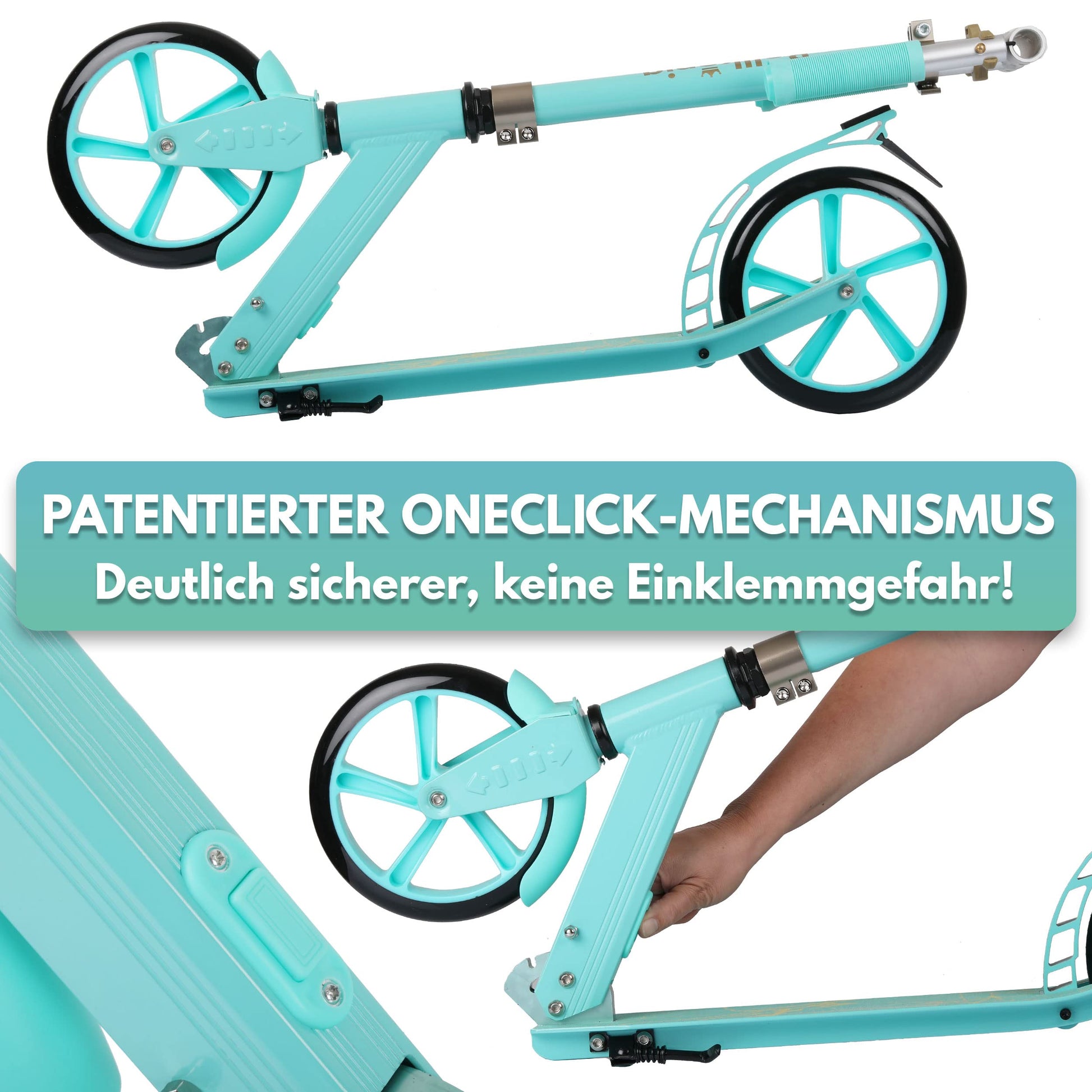 - Patentierter Faltmechanismus: Dank eines einzigartigen 1-Knopf-Systems lässt sich das Trottinett blitzschnell und sicher zusammenklappen, ganz ohne Quetschgefahr.