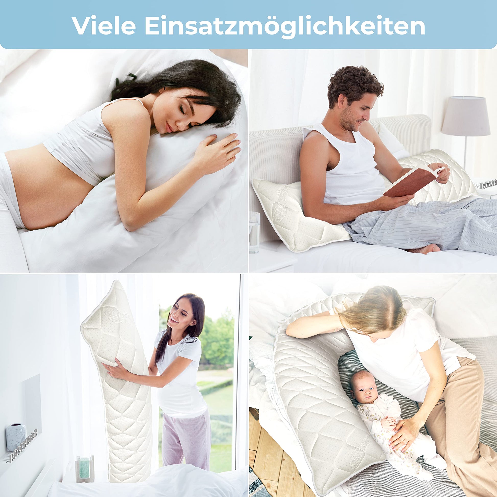 Absolut. Mit seinen Massen von 40 x 145 cm bietet es eine hervorragende Stütze für Bauch, Rücken und Knie. Das Kissen hilft, eine stabile und bequeme Seitenlage zu finden, was besonders während der Schwangerschaft als sehr entlastend empfunden wird.