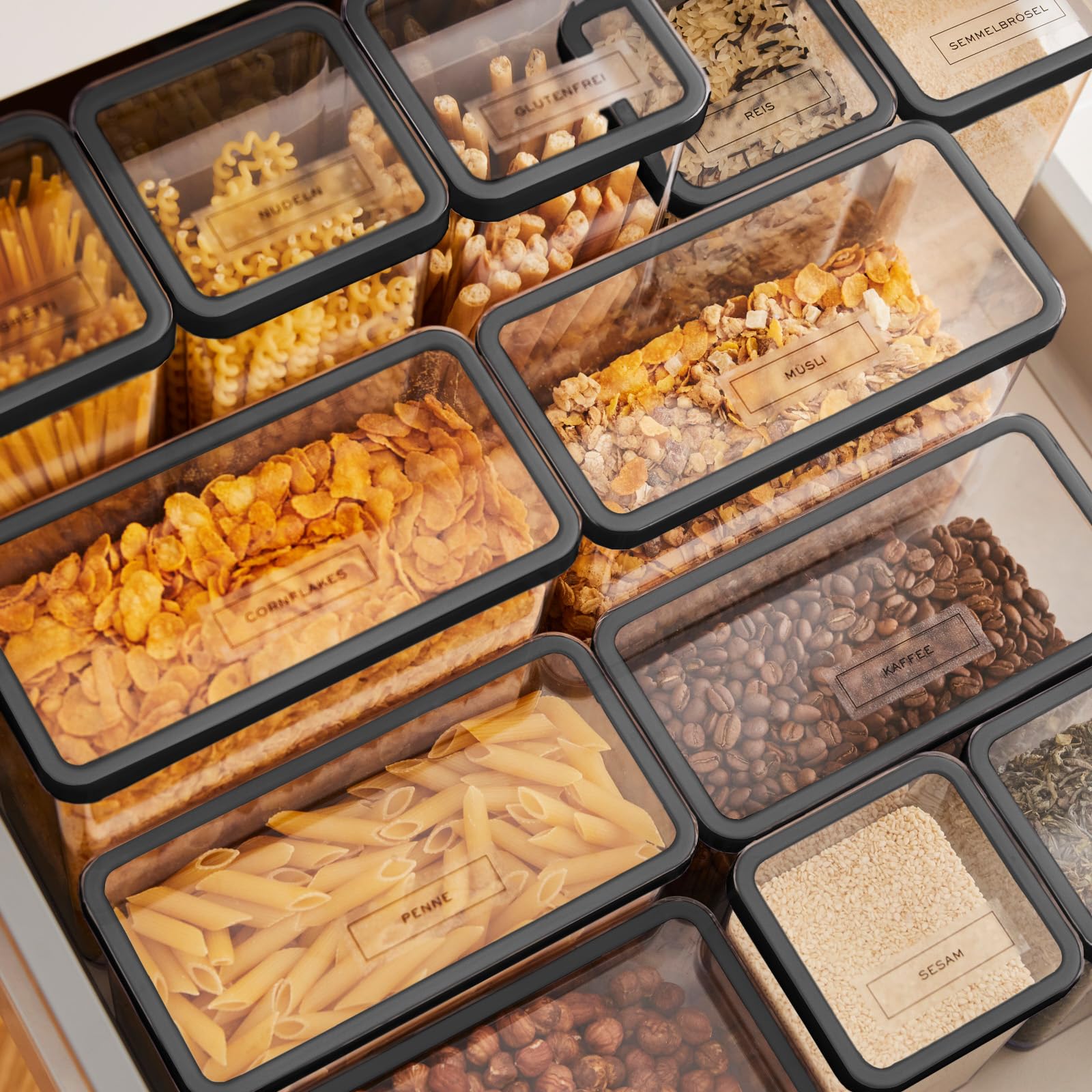 Dank des luftdichten Verschlusses bleiben Ihre Lebensmittel wie Mehl, Zucker, Müsli oder Nudeln deutlich länger frisch und behalten ihr volles Aroma. Das transparente Design spart Zeit und Mühe, da Sie stets den Überblick über Ihre Vorräte haben, ohne jede Dose öffnen zu müssen. Die Organisation in Ihrer Küche wird so zum Kinderspiel.