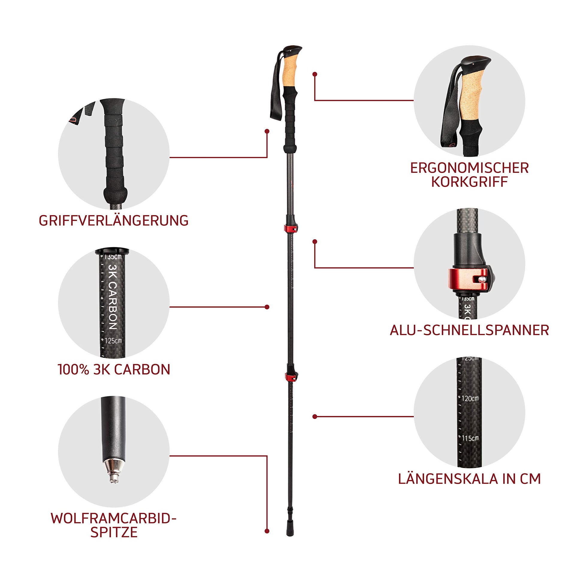 Diese Trekkingstöcke aus hochwertigem Carbon sind die idealen und zuverlässigen Begleiter für Ihre Wanderungen. Sie vereinen ein extrem geringes Gewicht mit hoher Stabilität und durchdachten, benutzerfreundlichen Details.