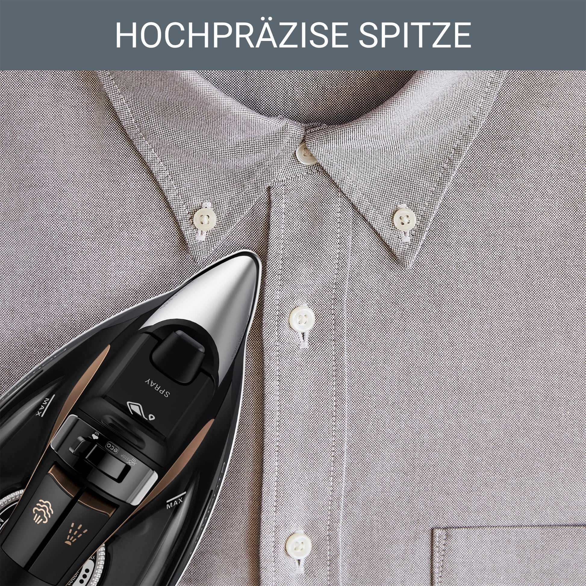 - Präzisionsspitze: Ermöglicht das mühelose Bügeln von schwer zugänglichen Stellen wie Kragen, Nähten und Knopfleisten.