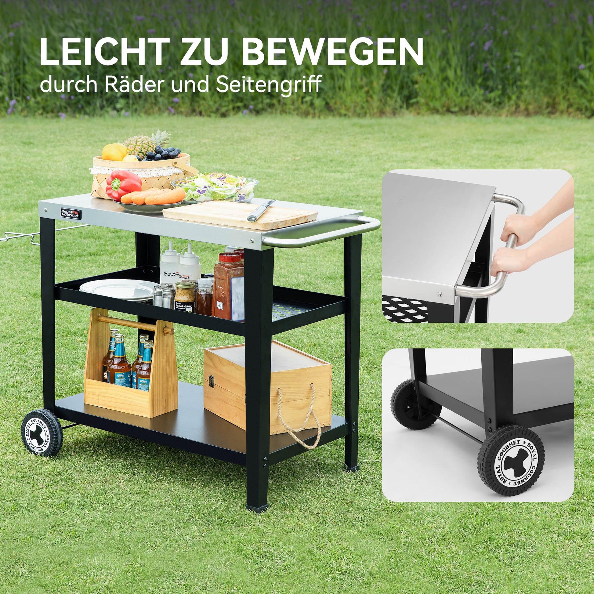 Die stabile Konstruktion aus einer langlebigen Edelstahlplatte und einem robusten Stahlrohrrahmen garantiert einen sicheren Stand. Obwohl keine exakten Gewichtsgrenzen angegeben sind, ist der Wagen darauf ausgelegt, Grillgut, Küchenutensilien, Gewürze und Getränkekisten mühelos zu tragen.