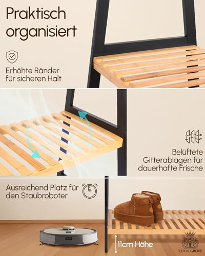 Die solide Konstruktion aus Bambus, dessen Zugfestigkeit die von Eichenholz übertrifft, garantiert einen sicheren Stand – selbst wenn die Kleiderstange mit schweren Wintermänteln voll beladen ist. Die erhöhten Seitenränder der Regale bieten zusätzlichen Schutz für Ihre Taschen, Schuhe und Accessoires und sorgen für eine stets aufgeräumte Optik.