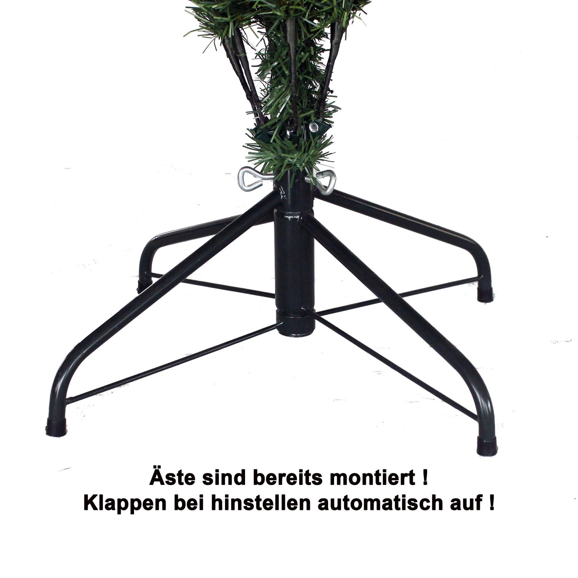 Dank des cleveren Klapp- bzw. Regenschirmsystems ist dieser Tannenbaum in nur wenigen Minuten vollständig aufgestellt. Die einzelnen Elemente werden einfach ineinandergesteckt und die Äste klappen von selbst auseinander. Sie müssen diese nur noch in die gewünschte Form biegen und können sofort mit dem Schmücken beginnen.