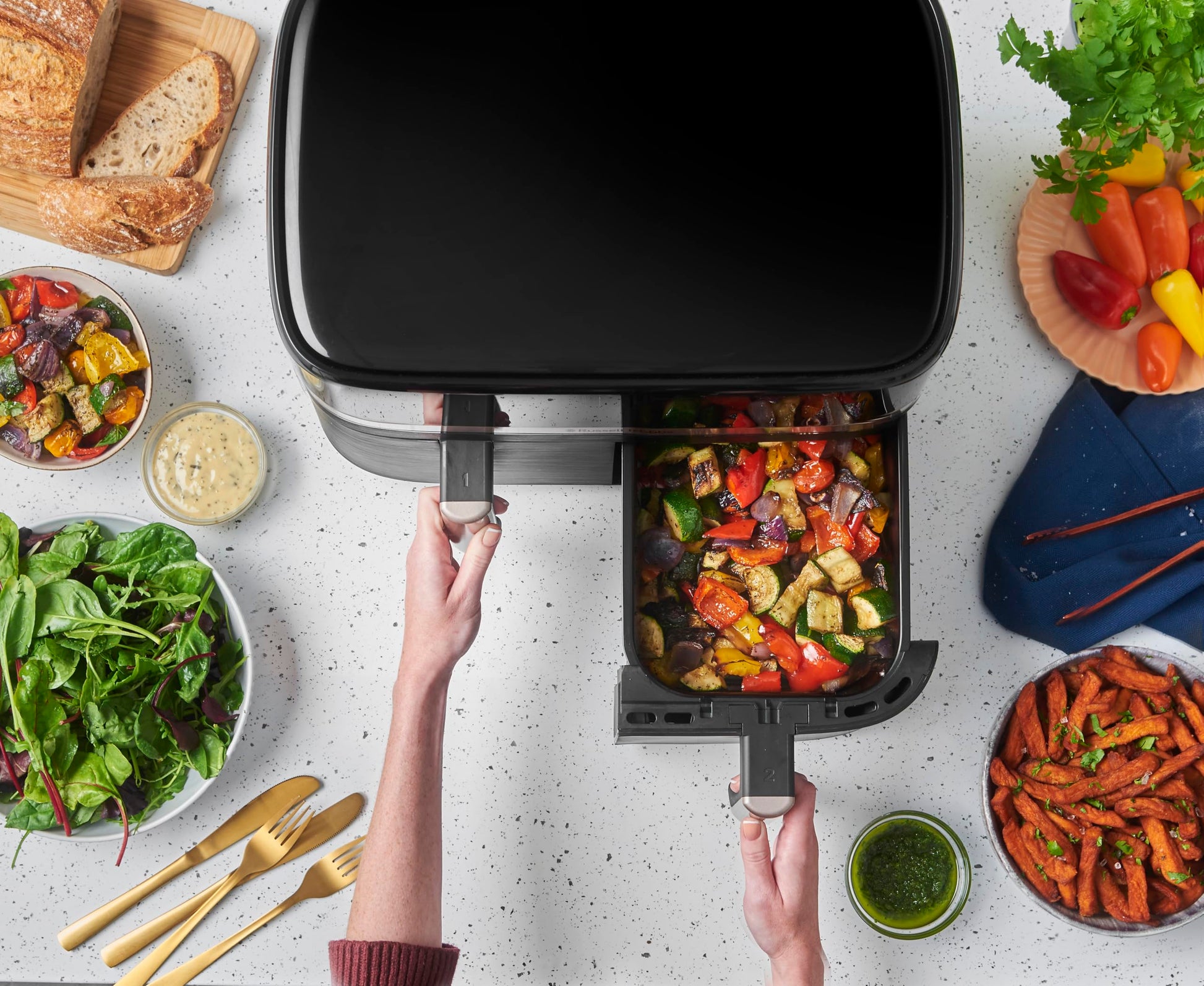 Diese Doppelkammer-Heissluftfritteuse ist der perfekte Partner für eine moderne, schnelle und gesunde Küche.