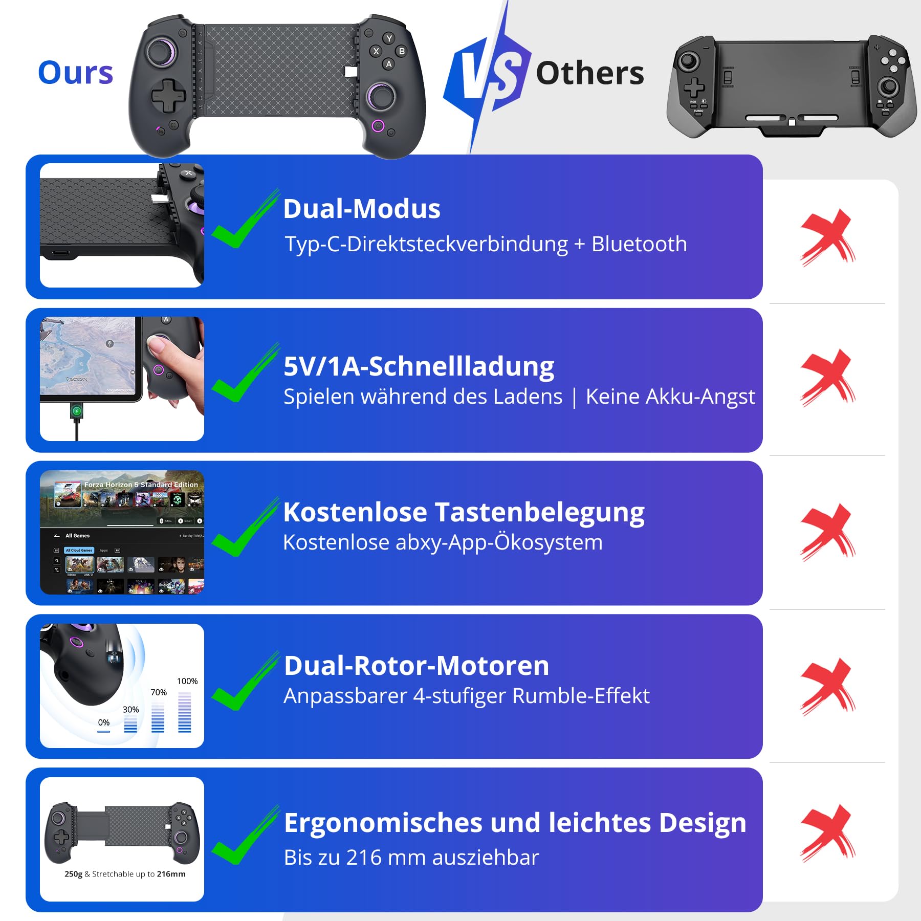 Maximale Kompatibilität: Der Controller ist via USB-C und Bluetooth kompatibel mit dem iPhone 15/16, iPad Mini 6/7 und einer Vielzahl von Android-Geräten. Die ausziehbare Halterung fasst Geräte bis zu einer Grösse von 216 mm (ca. 8.8 Zoll), wodurch auch kleinere Tablets problemlos Platz finden.