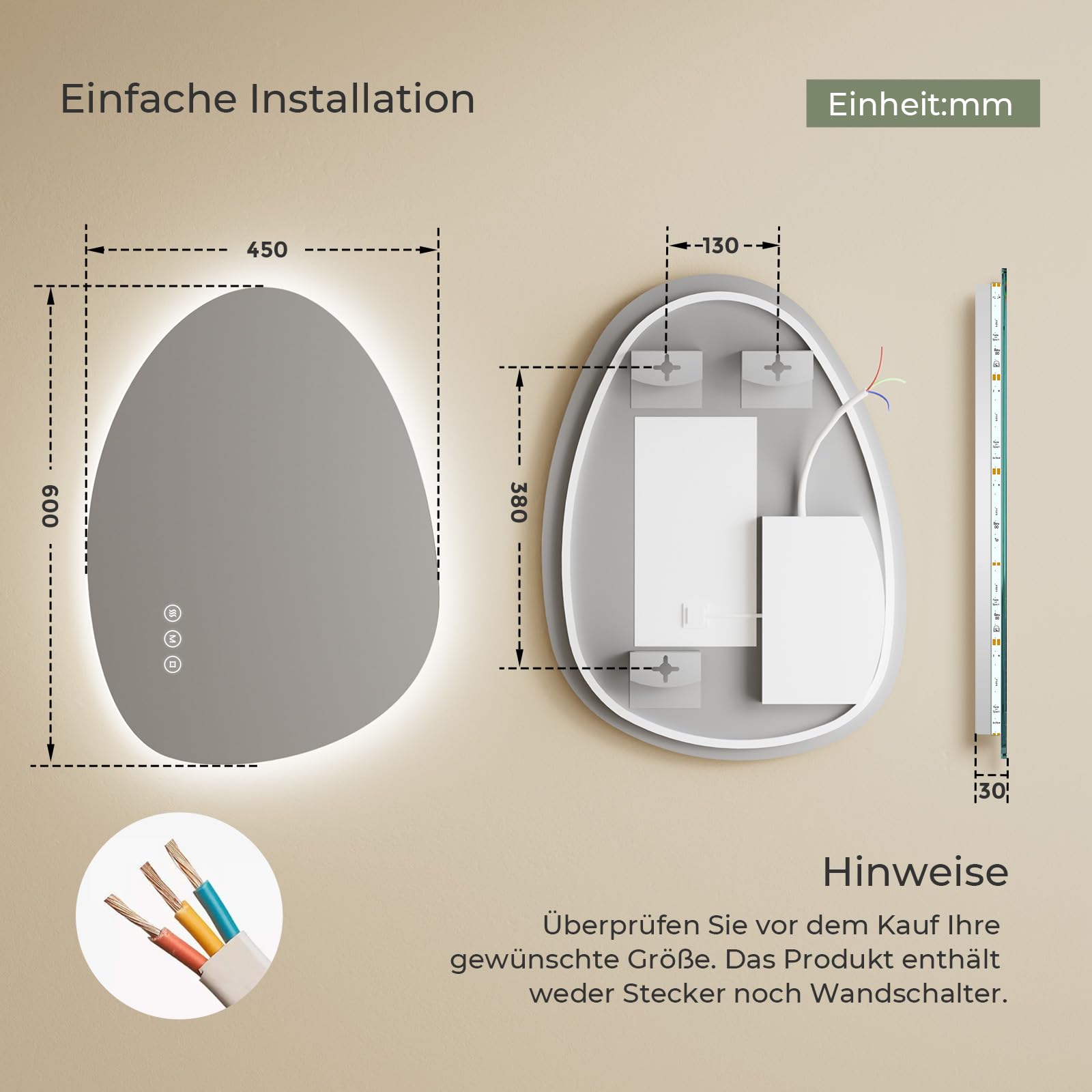 Der LED-Spiegel ist für den direkten Anschluss an einen 230V-Wandanschluss im Badezimmer konzipiert, wie er üblicherweise für die Badbeleuchtung vorhanden ist. Für eine sichere Installation empfehlen wir, einen qualifizierten Elektriker zu konsultieren.