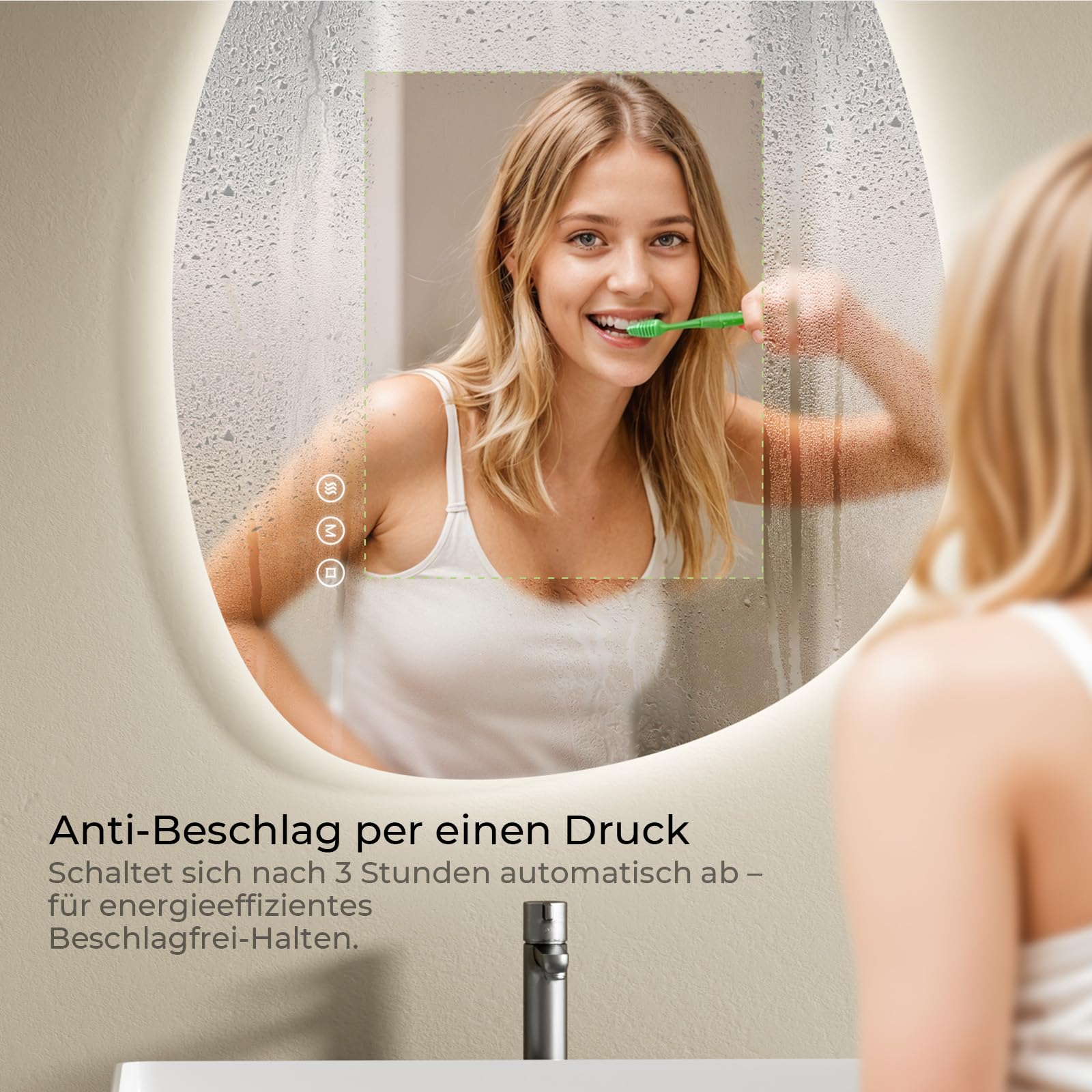 Die Anti-Beschlag-Funktion ist eine integrierte Heizmatte, die eine klare Sicht auch nach einer heissen Dusche garantiert. Sie wird über den Touch-Schalter separat und unabhängig von der Beleuchtung gesteuert, sodass Sie sie nur bei Bedarf einschalten können.