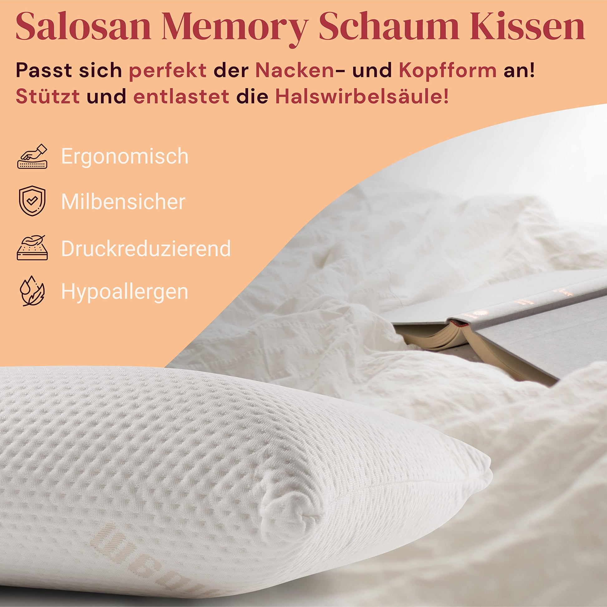 Das orthopädische Nackenkissen von Salosan wurde entwickelt, um Ihnen einen erholsamen Schlaf zu ermöglichen und Verspannungen gezielt entgegenzuwirken. Es kombiniert eine ergonomische Form mit hochwertigem Memory-Schaum, um Ihren Nacken- und Schulterbereich optimal zu stützen.