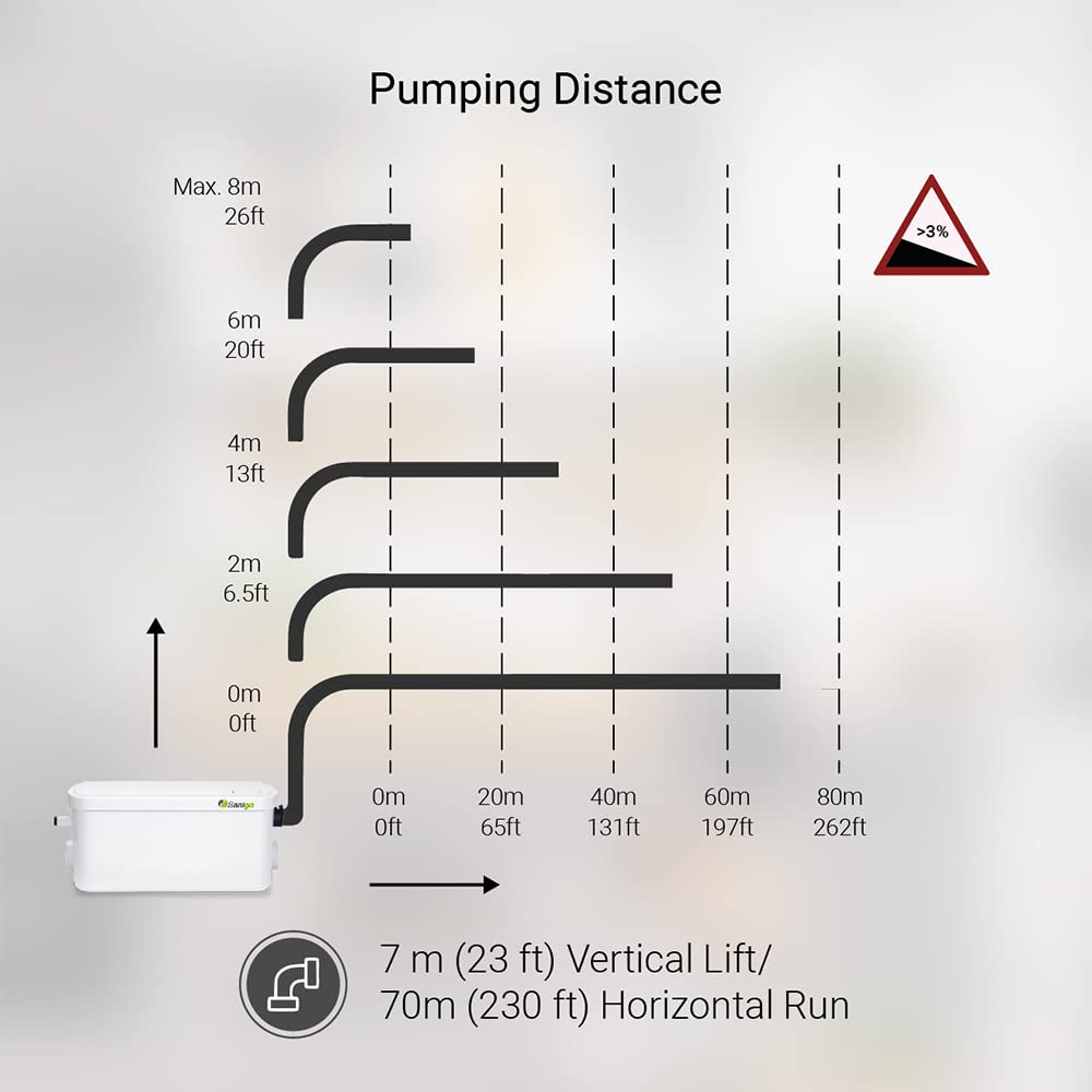 Die Förderkapazität der Hebeanlage hängt vom Verhältnis zwischen vertikaler Förderhöhe und horizontaler Förderweite ab. Als Faustregel gilt: 1 Meter Förderhöhe entspricht 10 Metern Förderweite. Bitte beachten Sie bei der Installation folgende Richtwerte: