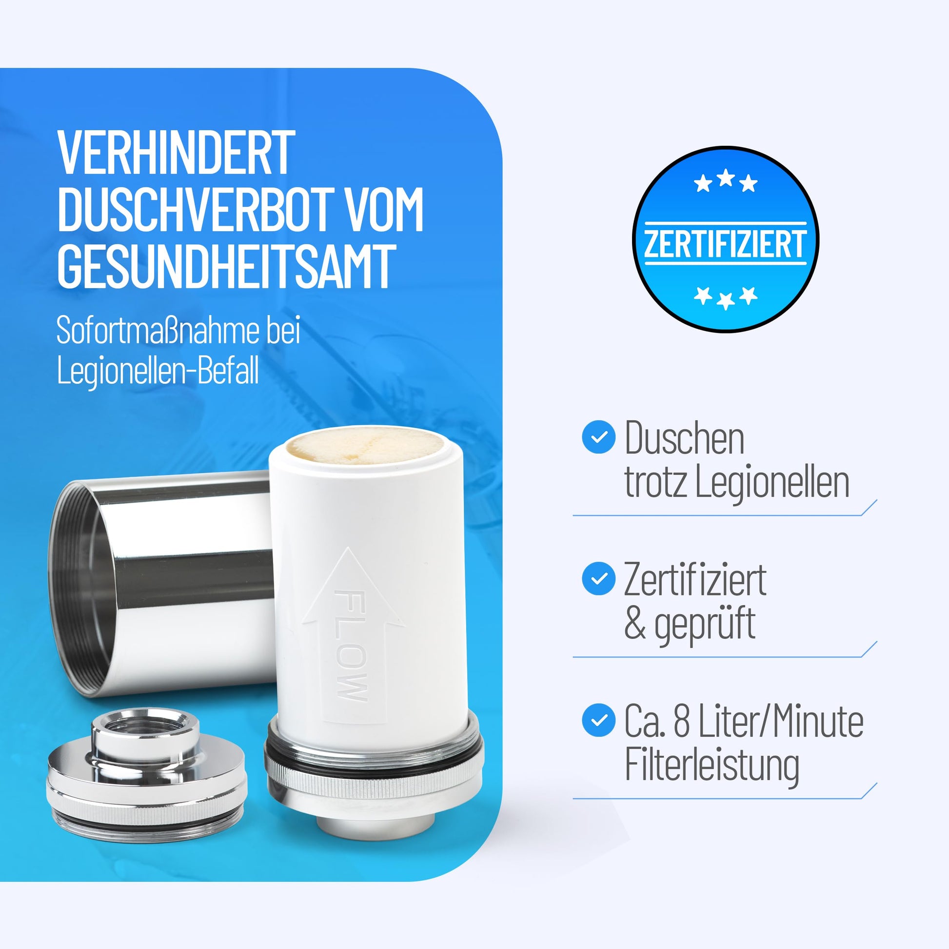Schützen Sie die Gesundheit Ihrer Familie, Ihrer Mieter oder Ihrer Hotelgäste aktiv vor den Gefahren einer Legionelleninfektion. Gerade in Mietwohnungen, Ferienobjekten oder Hotels bietet dieser Filter eine effektive Präventionsmassnahme und hilft, behördliche Anordnungen wie ein Duschverbot zu vermeiden.