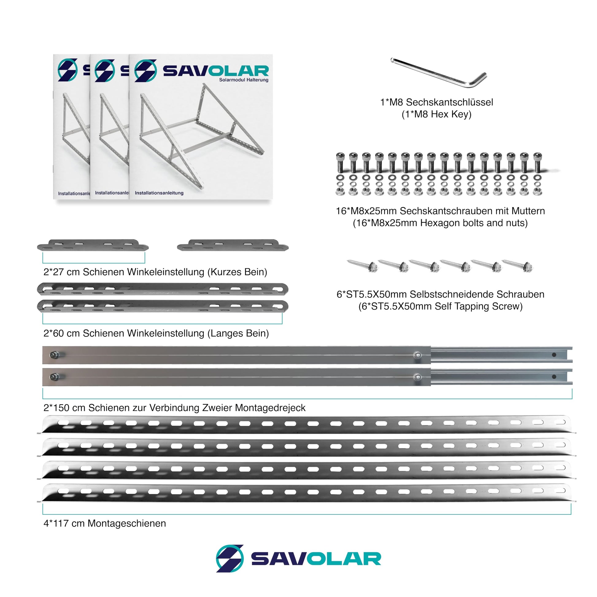 Das Set enthält alle Bauteile, um die Halterung selbst zusammenzubauen und das Solarmodul daran zu befestigen, inklusive korrosionsbeständiger Schrauben aus Edelstahl oder verzinktem Stahl. Spezifisches Befestigungsmaterial für die Wand, das Dach oder das Balkongeländer (z.B. Dübel, Stockschrauben) ist nicht enthalten, da dieses je nach Untergrund individuell gewählt werden muss.