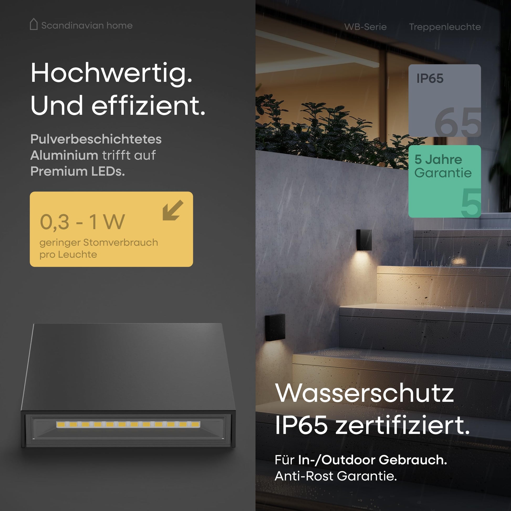 Ob Regen, Frost oder Sturm – die robuste und wetterfeste Bauweise nach Schutzklasse IP65 stellt sicher, dass Ihre Treppenbeleuchtung allen Witterungsbedingungen standhält. Dies macht sie zur perfekten Wahl für Aussentreppen, Wege oder Terrassen.