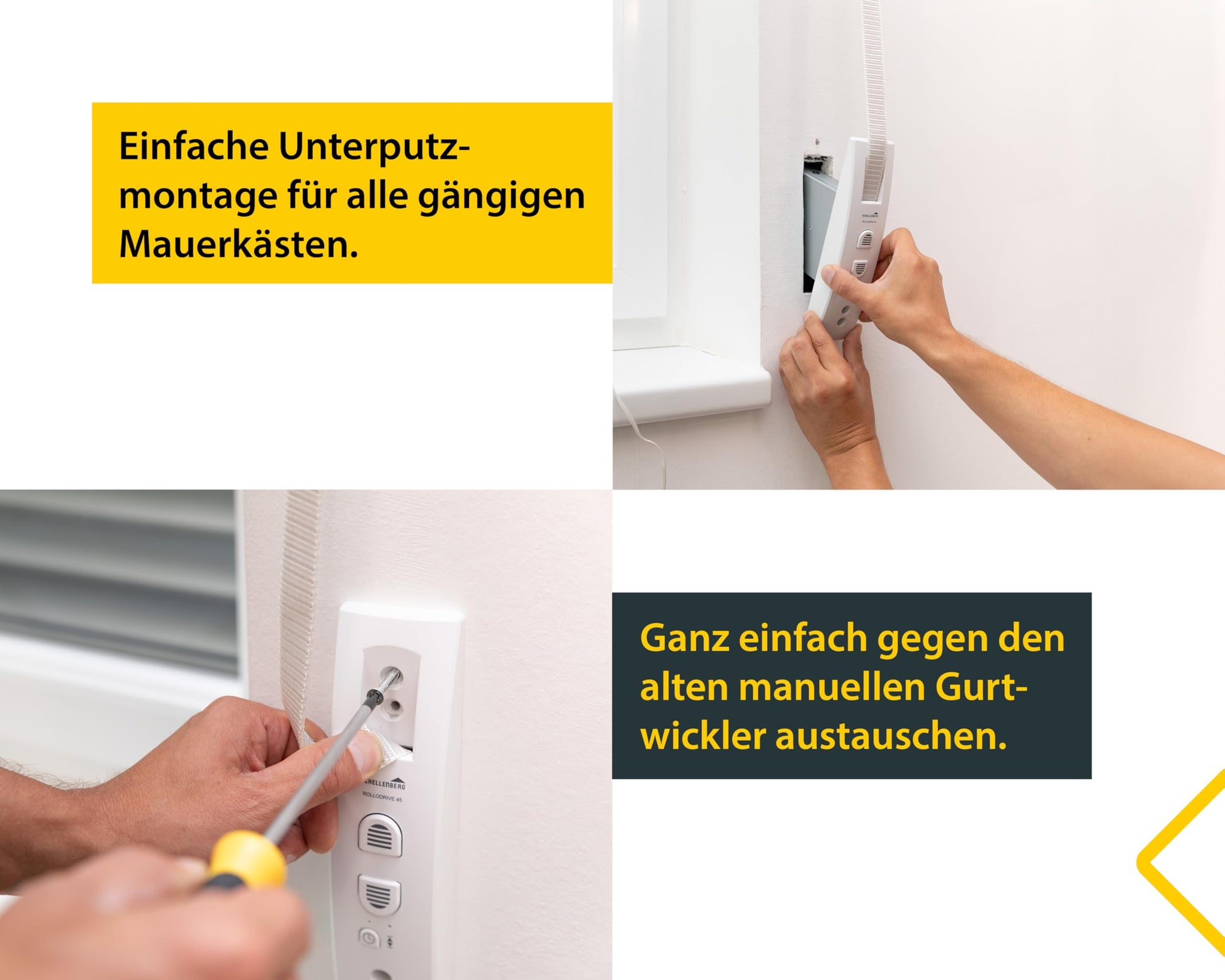 - Motorbetriebener Unterputz-Gurtwickler für den Einbau in gängige Mauerkästen.