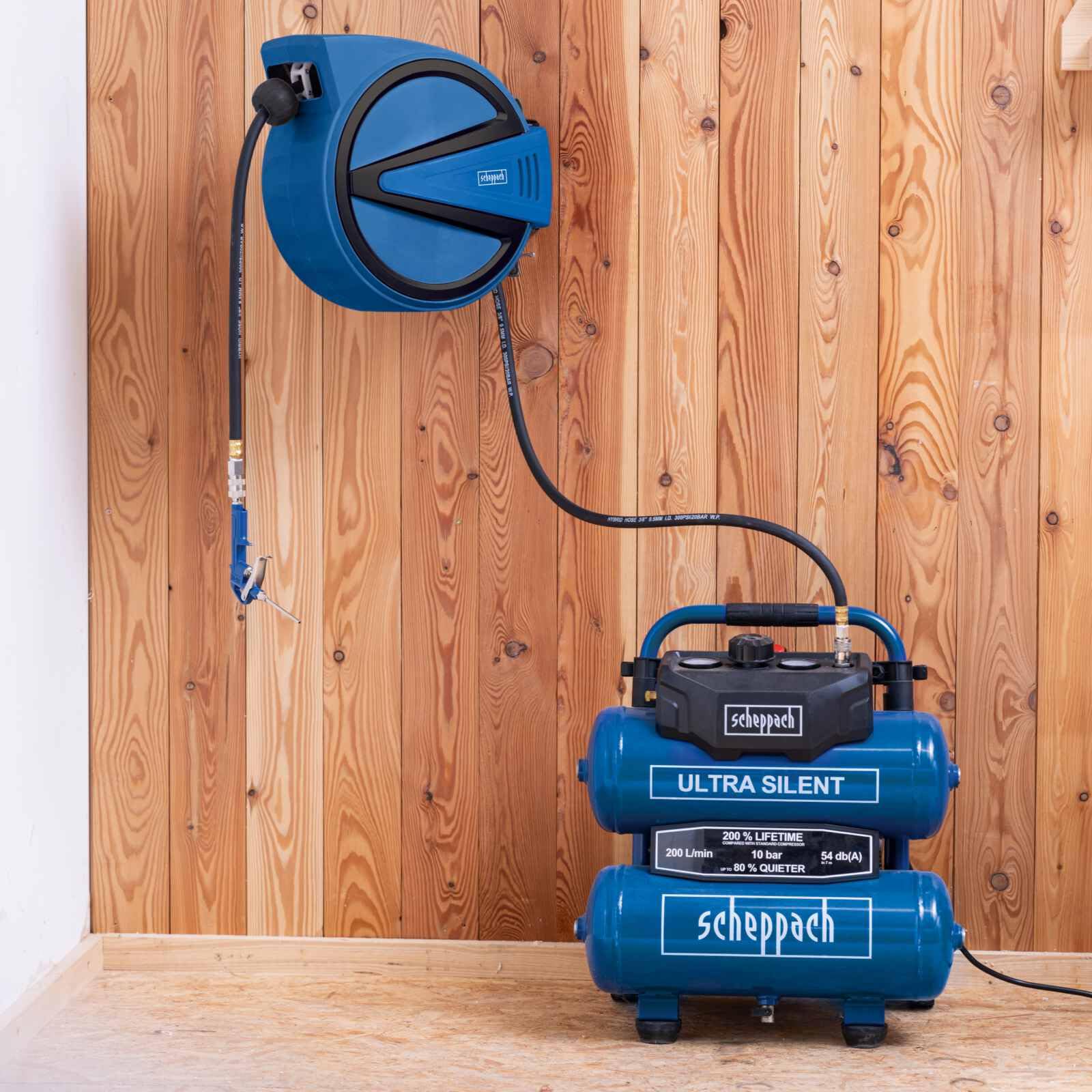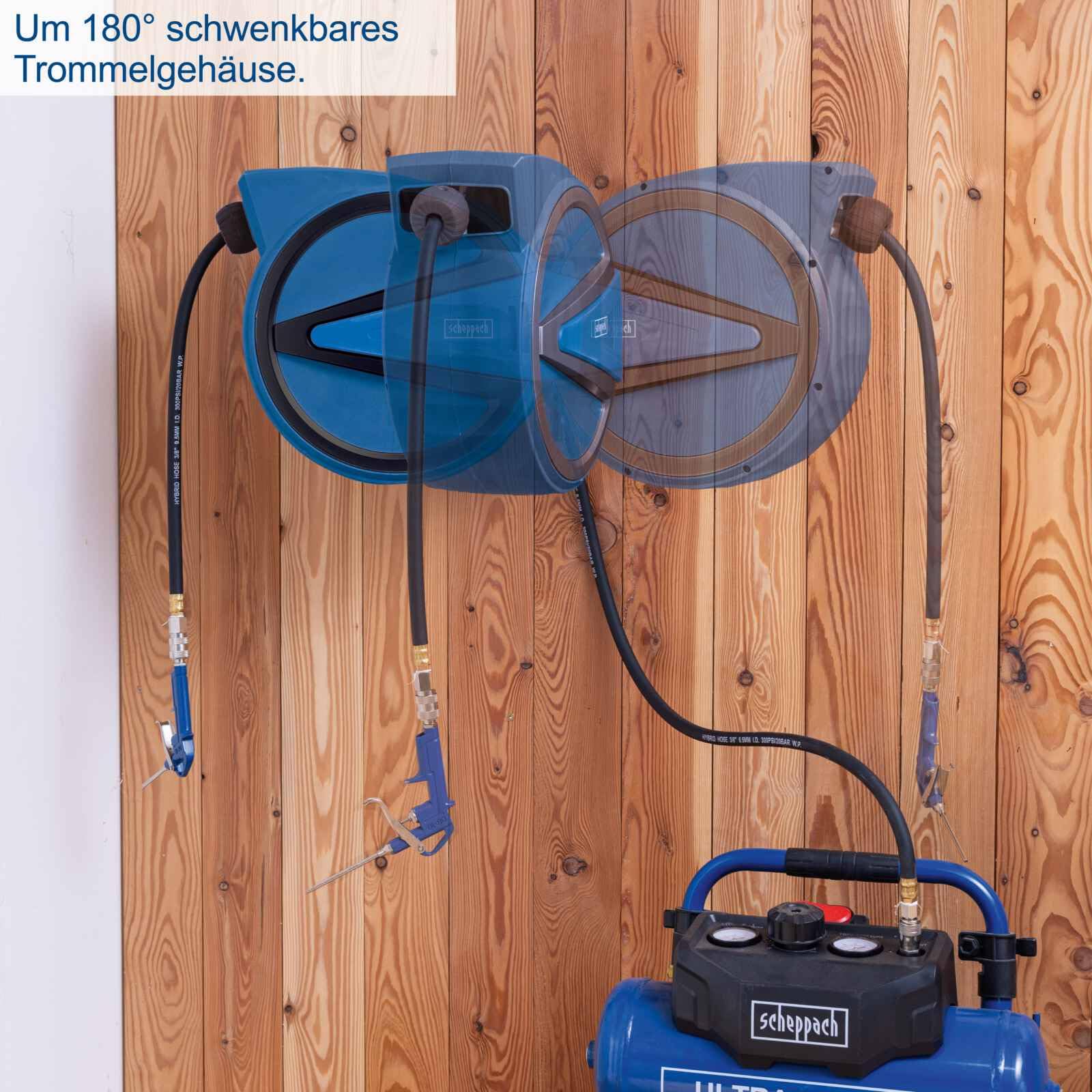 Diese automatische Schlauchtrommel von Scheppach ist der ideale Helfer, um Ordnung und Effizienz in Ihre Werkstatt oder Garage zu bringen. Sie sorgt dafür, dass Ihr Druckluftschlauch stets griffbereit, sicher verstaut und frei von Knoten ist.