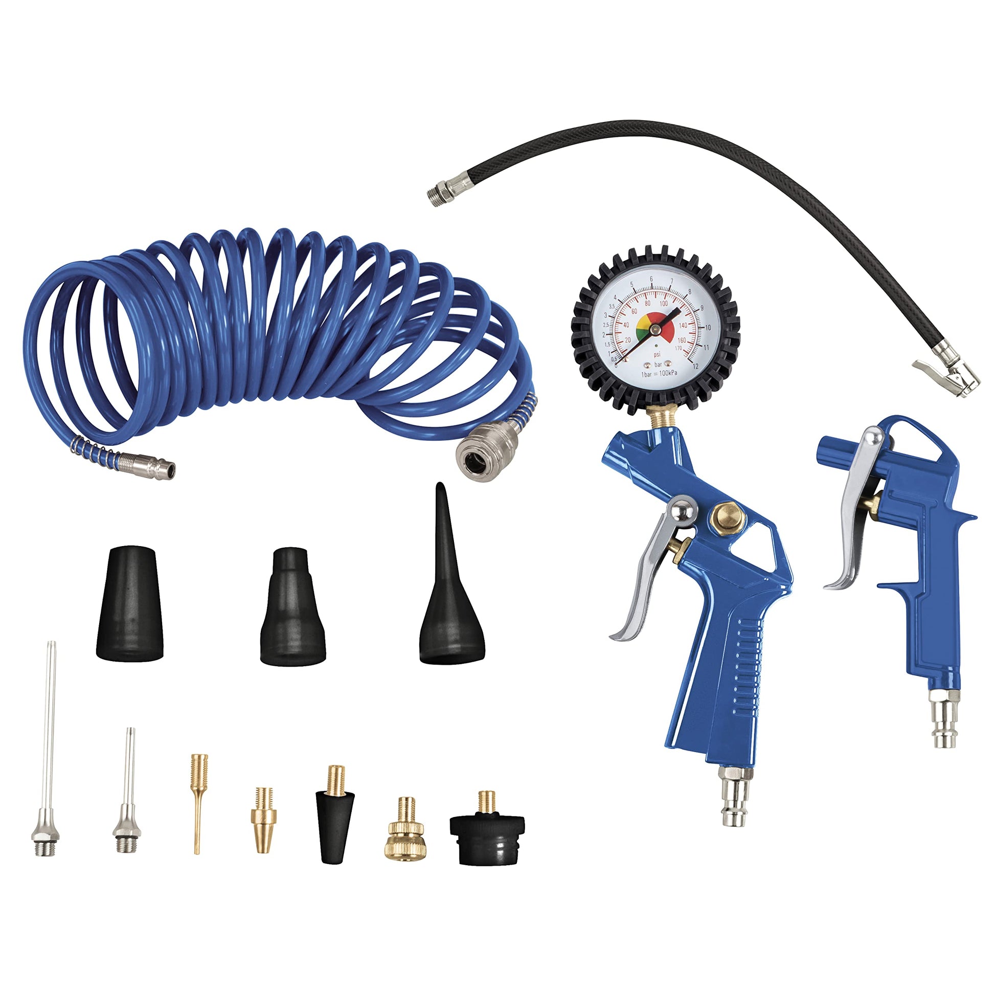Der Kompressor wird mit einem umfangreichen, mehrteiligen Zubehörset geliefert, das Sie sofort startklar macht. Dieses enthält typischerweise einen Druckluftschlauch, eine Ausblaspistole, einen Reifenfüller mit Manometer sowie verschiedene Düsen und Adapter für die gängigsten Anwendungen in Garage und Werkstatt.