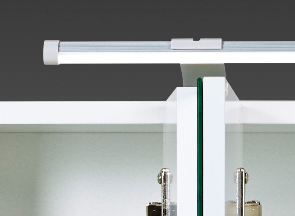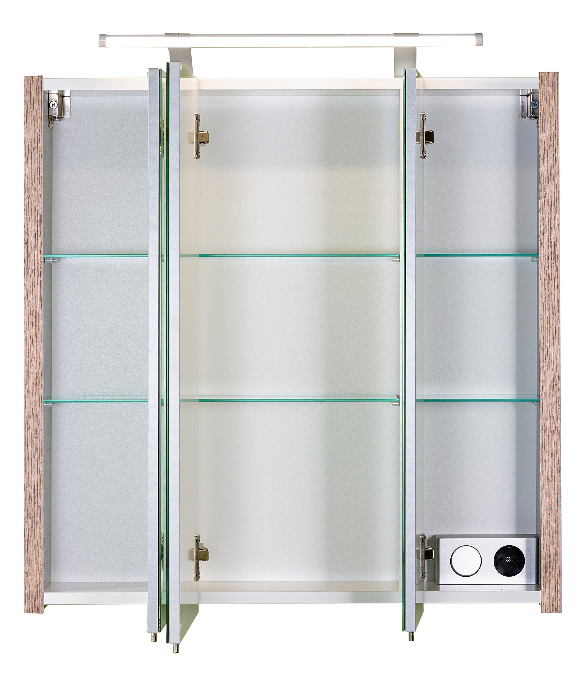Der Spiegelschrank verfügt über eine integrierte, moderne LED-Beleuchtung für optimale Lichtverhältnisse sowie eine praktische Kombination aus Schalter und Steckdose, ideal für den Anschluss von Rasierer oder elektrischer Zahnbürste.