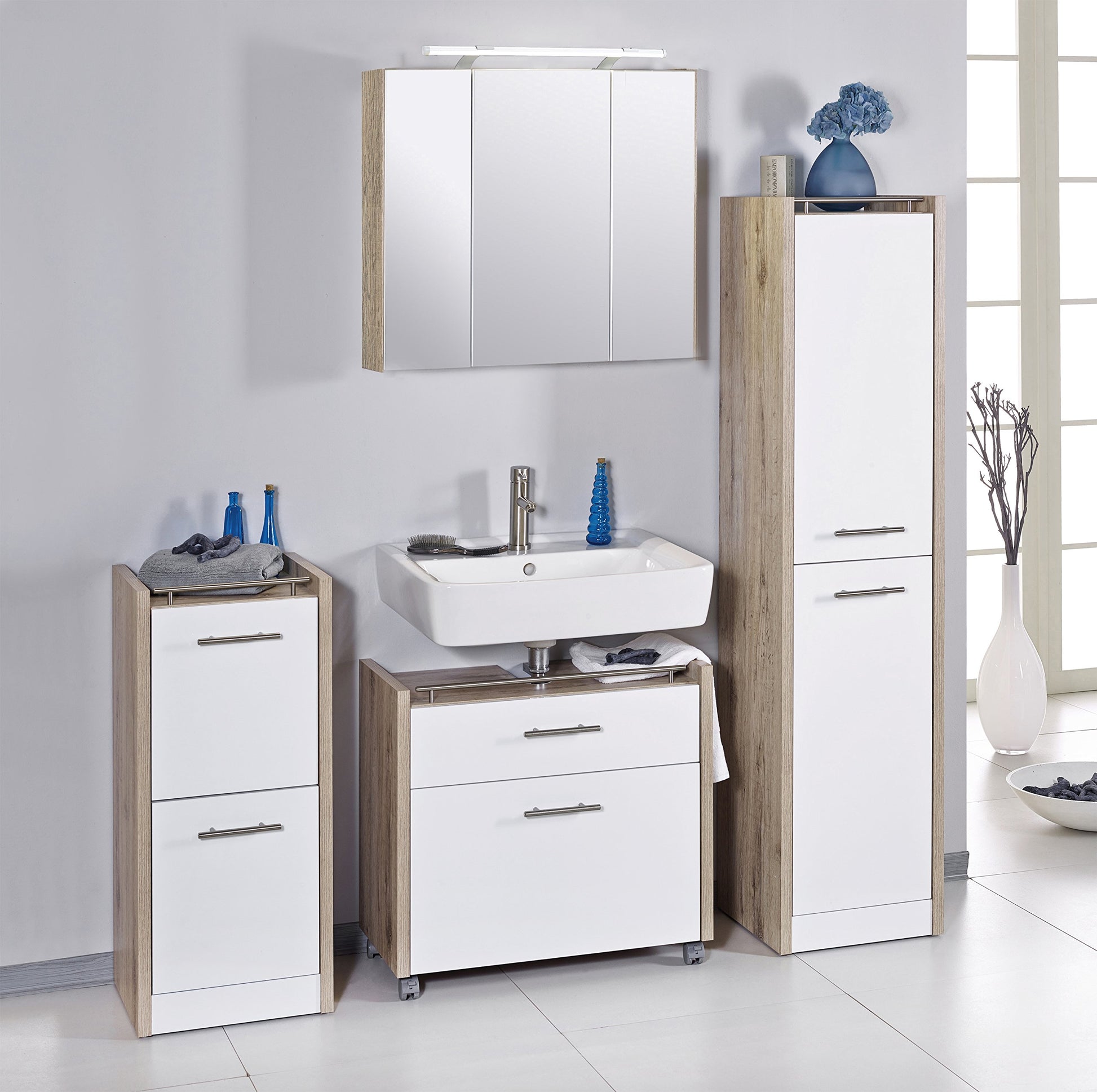 Der Korpus ist im ansprechenden Wildeiche-Dekor gehalten. Für eine hohe Langlebigkeit und Stabilität sind die Griffe sowie die Beschläge aus hochwertigem Metall gefertigt. Der Spiegelschrank wird sorgfältig in Deutschland hergestellt.