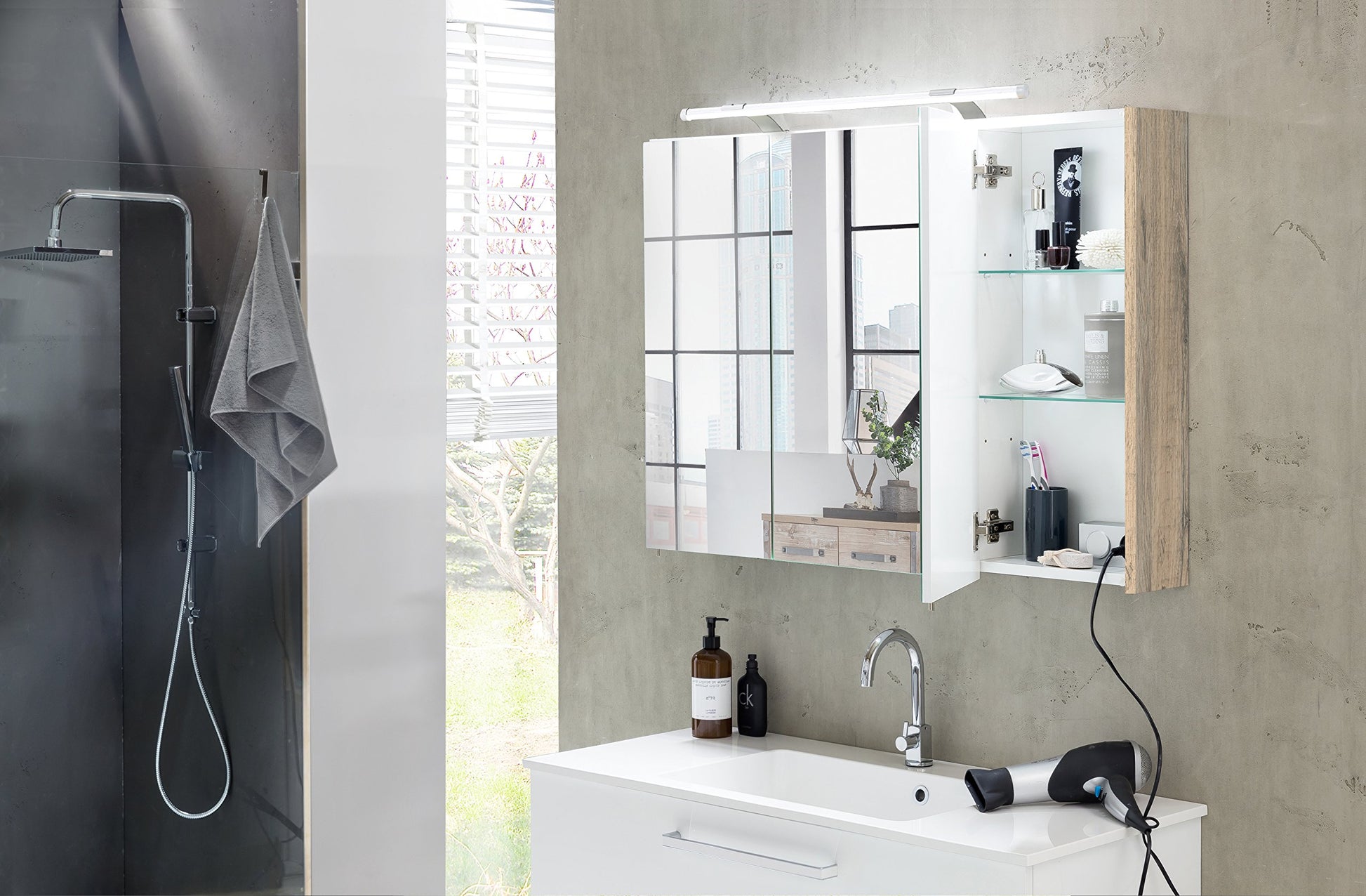 Die drei Spiegeltüren ermöglichen Ihnen eine perfekte Rundumsicht. Dies erleichtert die tägliche Gesichtspflege, das Rasieren oder das Styling der Haare erheblich, da Sie sich aus verschiedenen Blickwinkeln betrachten können.