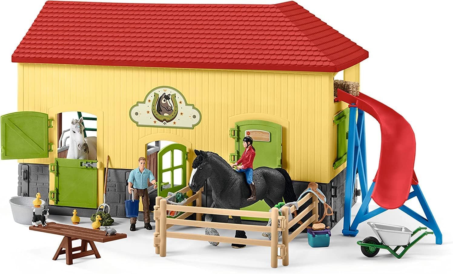 Absolut. Der Pferdestall ist Teil der Schleich FARM WORLD Kollektion und kann ideal mit anderen Sets wie dem Bauernhaus, dem Abenteuer Baumhaus oder weiteren Tieren und Fahrzeugen kombiniert werden. So kann die Spielwelt mit dem Kind mitwachsen und bietet immer wieder neue Abenteuer.