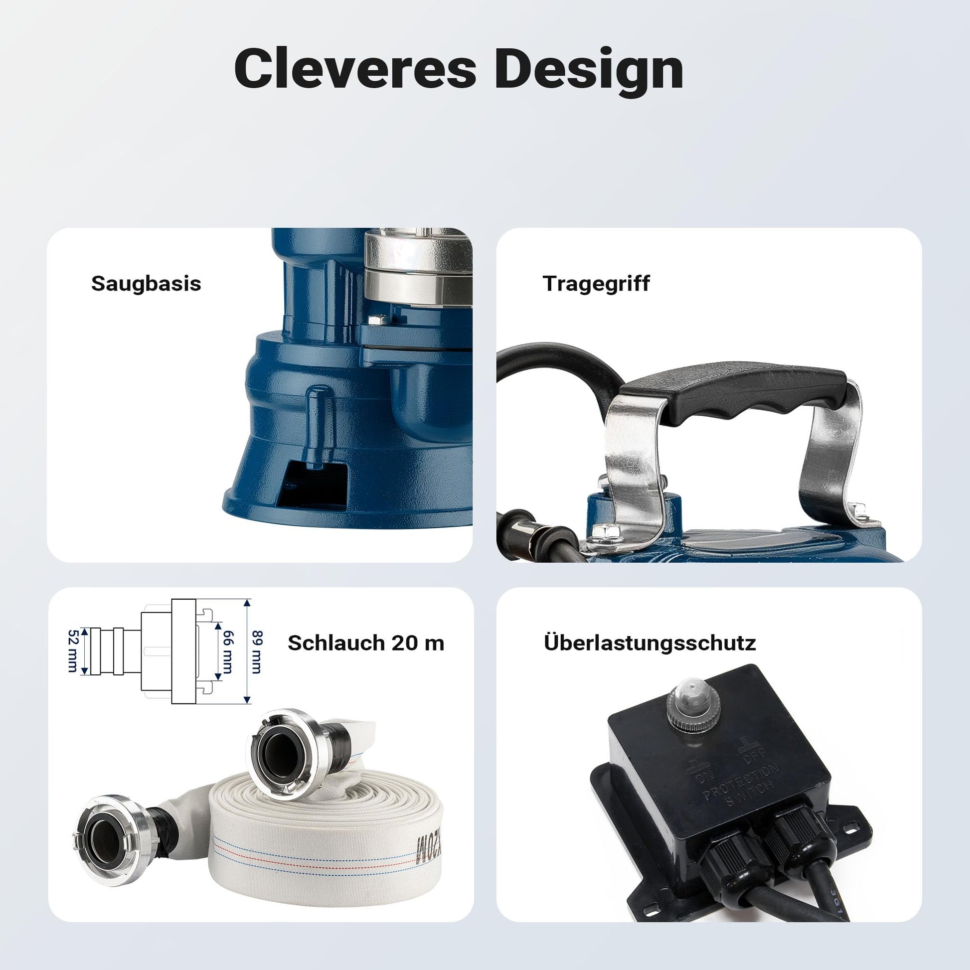 - Flexibler Einsatzbereich: Eignet sich perfekt zum Entwässern von Kellern, Pools und Gartenteichen oder für den Einsatz auf Baustellen.