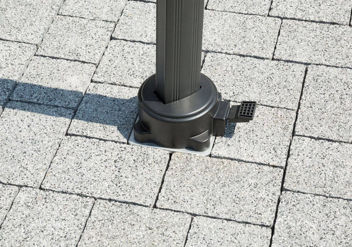 Die Platte ist speziell für eine dauerhaft sichere Verankerung konzipiert und wird direkt in ein Betonfundament im Boden eingelassen. Dies sorgt für eine felsenfest verankerte Basis für Ihren Sonnenschirm.