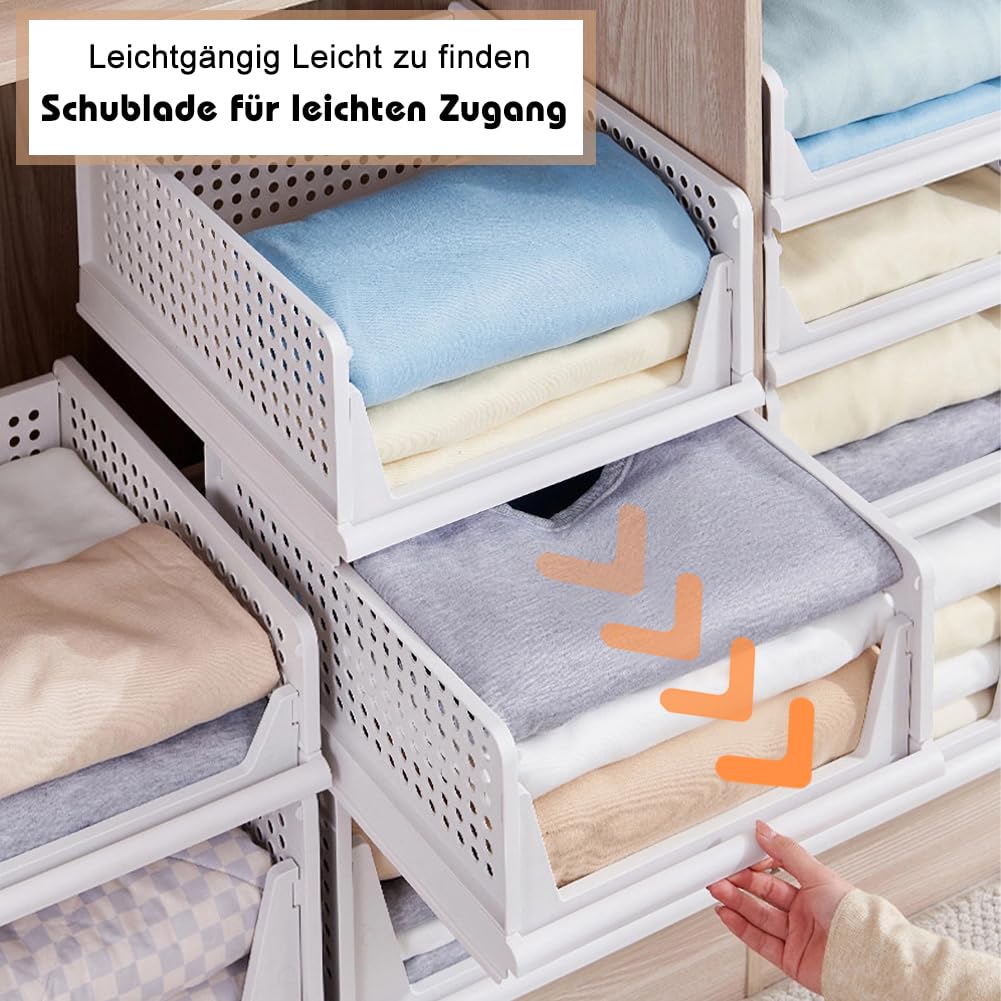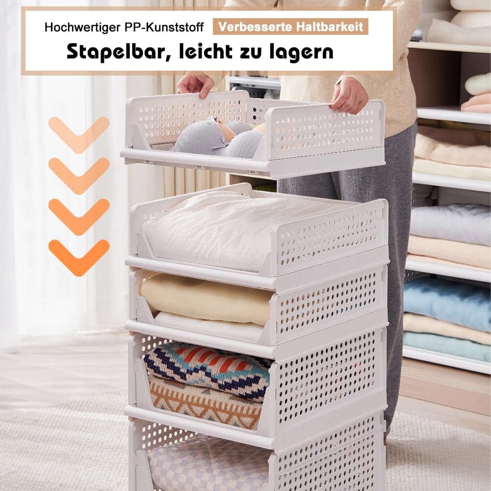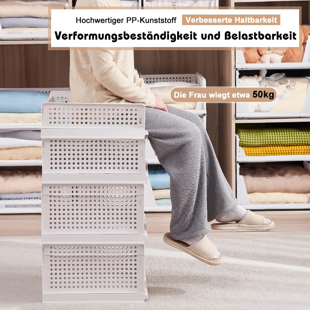 Die Boxen sind aus dickem, formstabilem Kunststoff gefertigt und für das sichere Stapeln konzipiert. Das Design sorgt für einen stabilen Stand, sodass Sie den vertikalen Platz in Ihrem Schrank oder Zimmer optimal ausnutzen können.