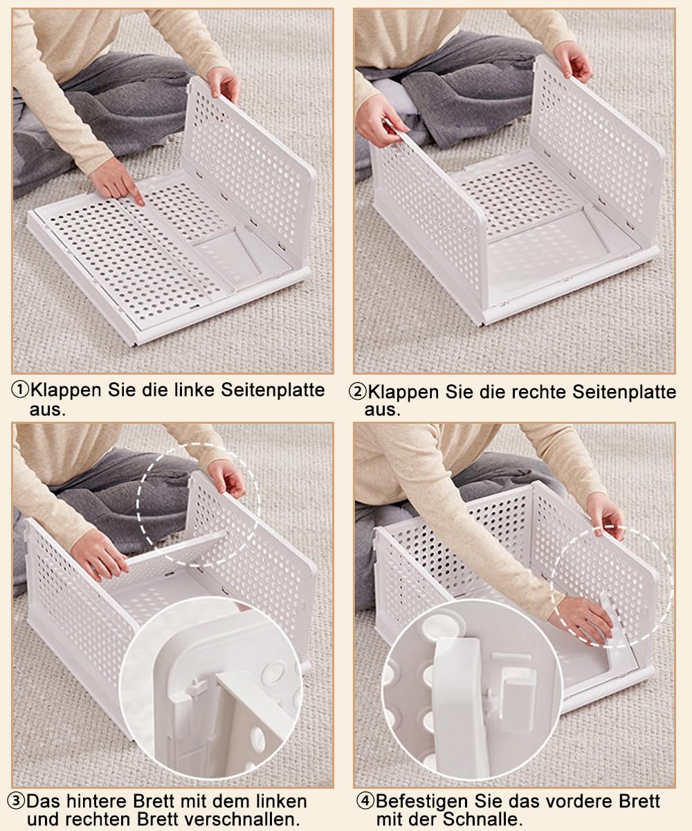 Der Aufbau ist kinderleicht und werkzeugfrei. Dank des cleveren Klick-Systems lassen sich die faltbaren Boxen in weniger als einer Minute pro Stück aufbauen und sind sofort einsatzbereit.