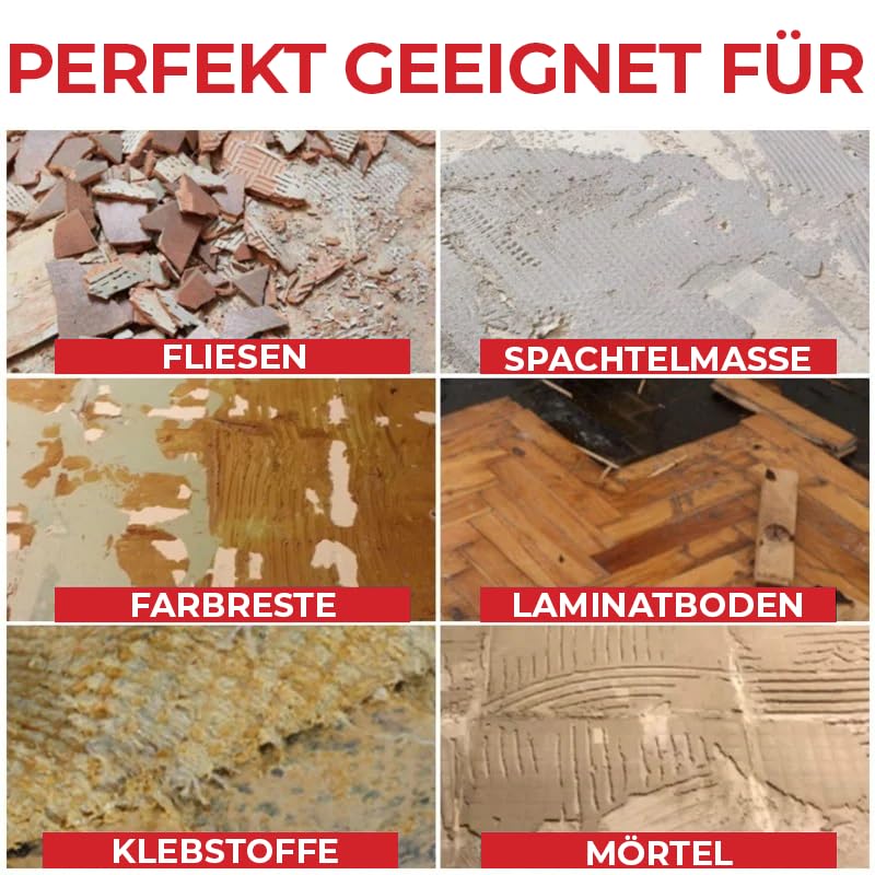 Er eignet sich ideal zur grossflächigen Entfernung von hartnäckigen Bodenbelägen und Rückständen. Dazu gehören Teppichreste, PVC- und Vinylböden, alte Farbschichten, Fliesenkleber und diverse andere Klebstoffe von unterschiedlichen Untergründen.