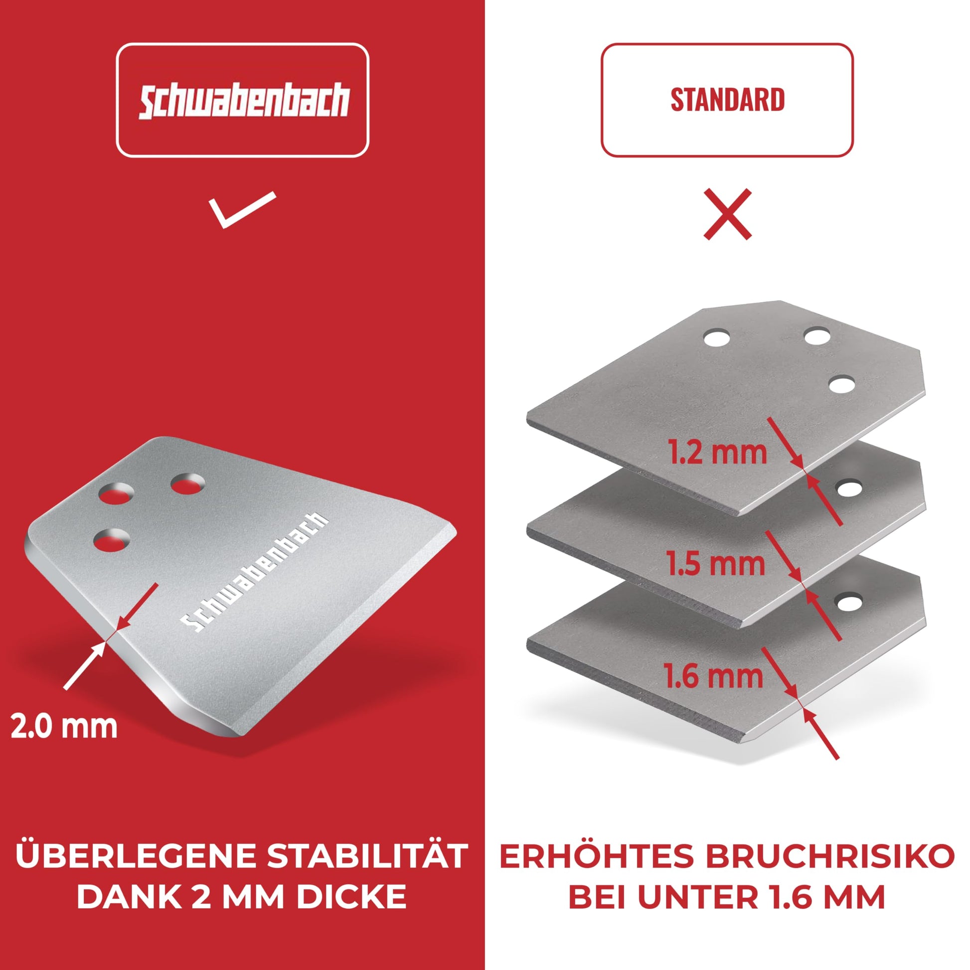 - Lieferumfang: 1x Spachtelmeissel, 1x Ersatzklinge, Befestigungsschrauben mit Sicherungsmuttern