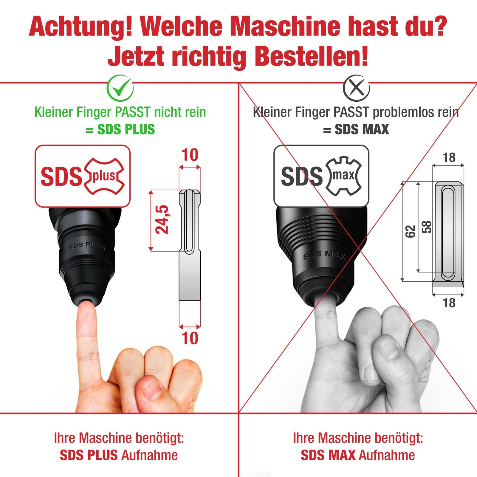 - Wichtiger Hinweis zur Kompatibilität: Dieser Meissel ist ausschliesslich für SDS-Plus-Aufnahmen mit einem Schaftdurchmesser von ca. 10 mm konzipiert. Er ist nicht mit grösseren SDS-Max-Systemen (ca. 18 mm Schaft) kompatibel. Bitte prüfen Sie vor dem Kauf den Anschluss Ihrer Maschine.
