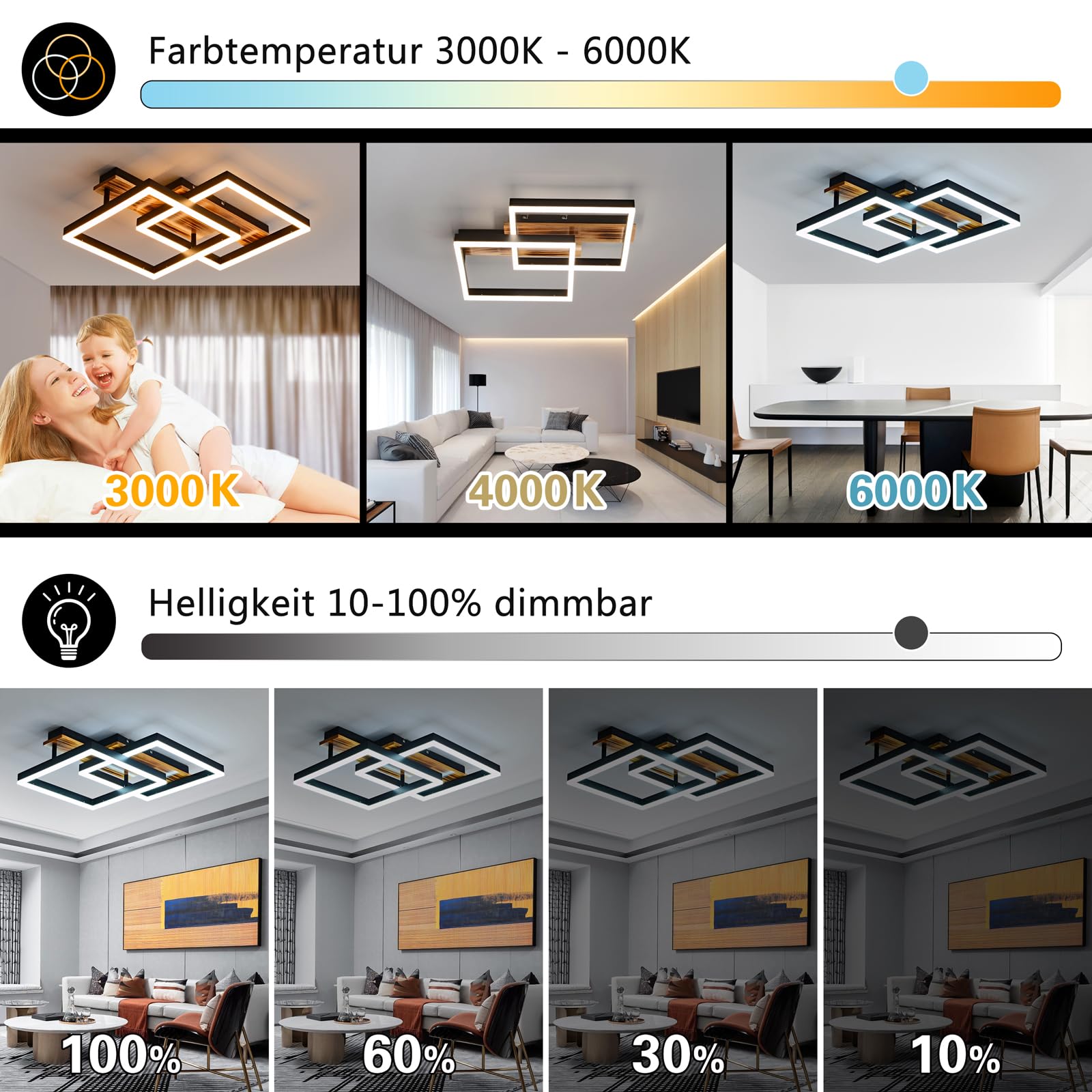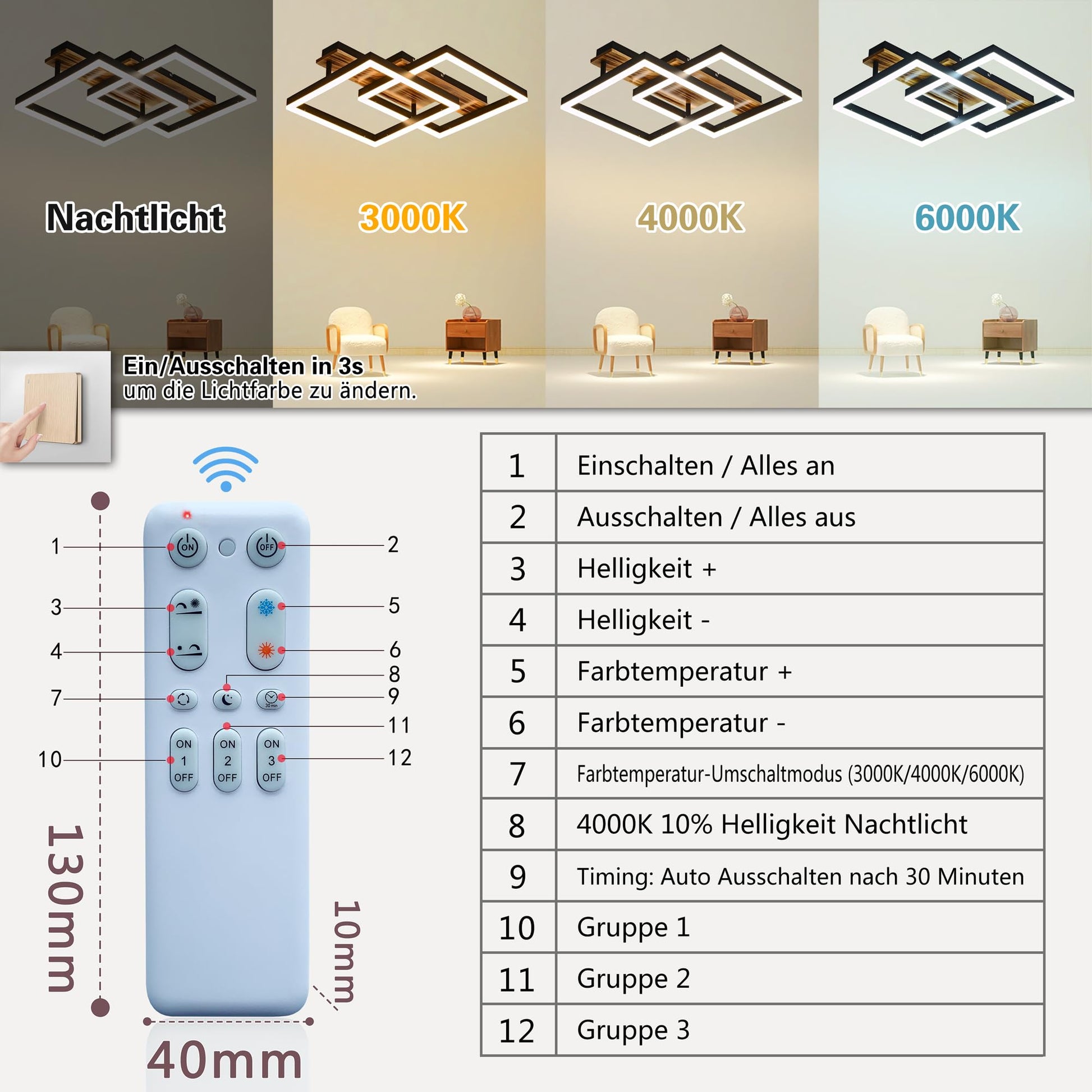 - Steuerung: Inklusive Fernbedienung zur stufenlosen Anpassung von Helligkeit (10-100%) und Farbtemperatur (3000-6000K).