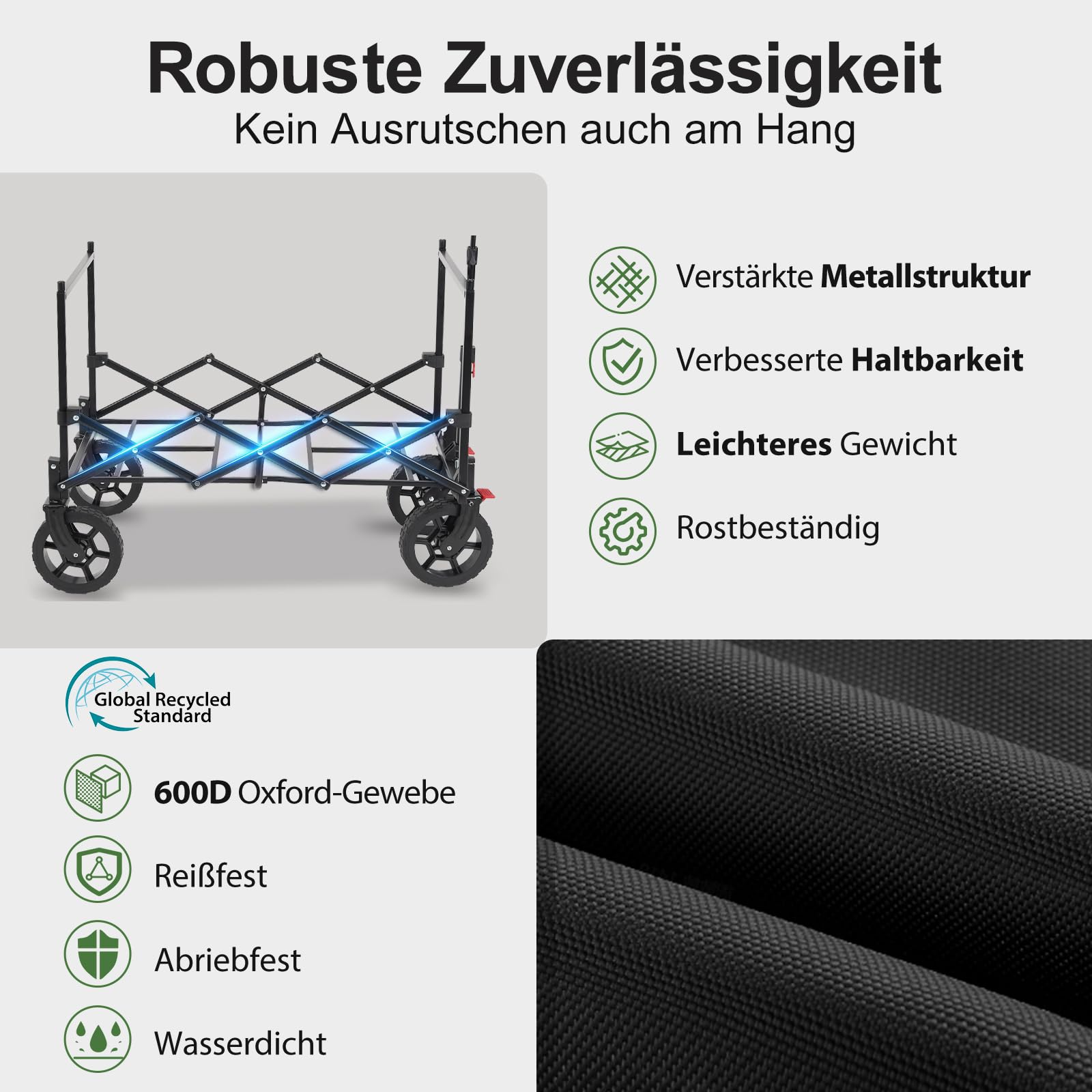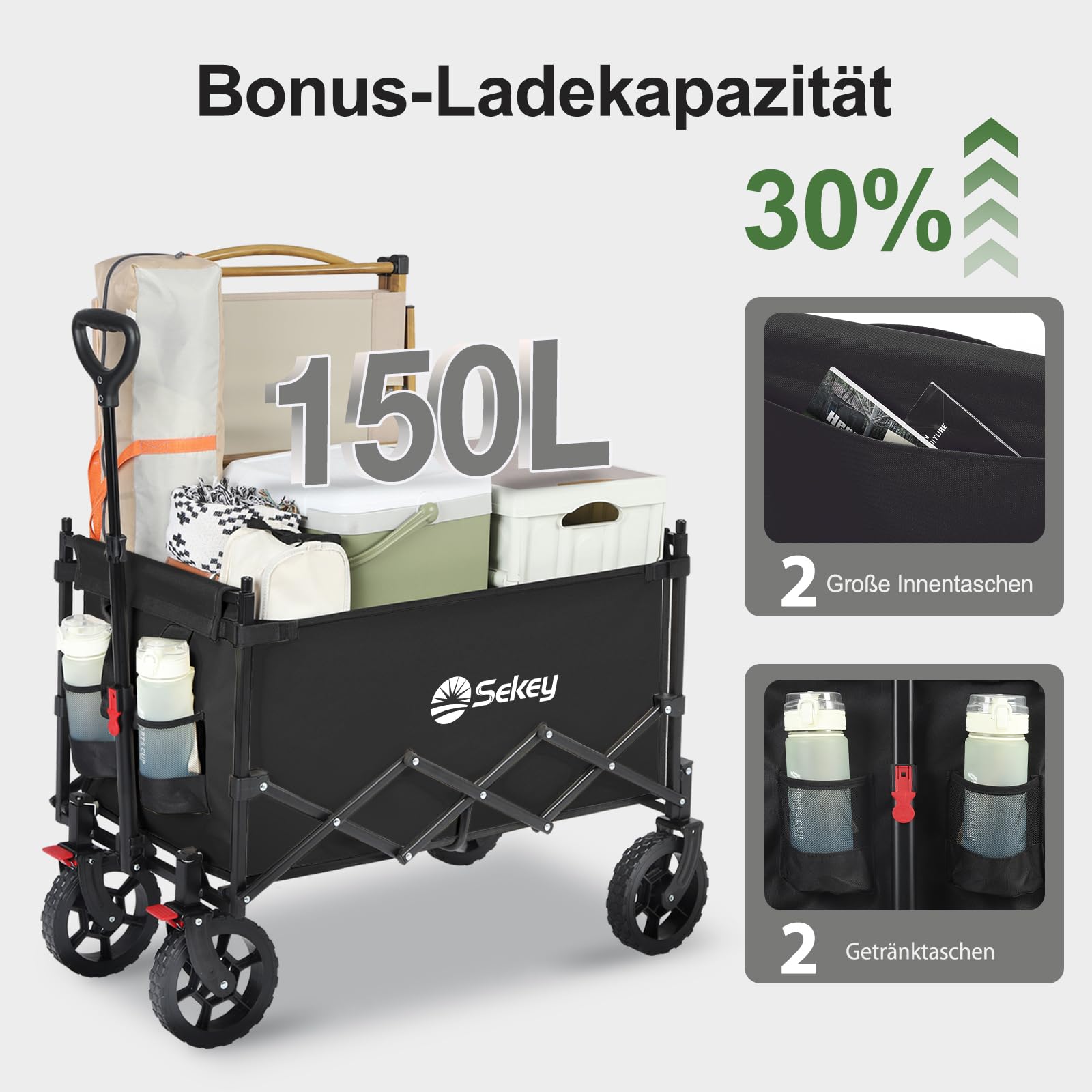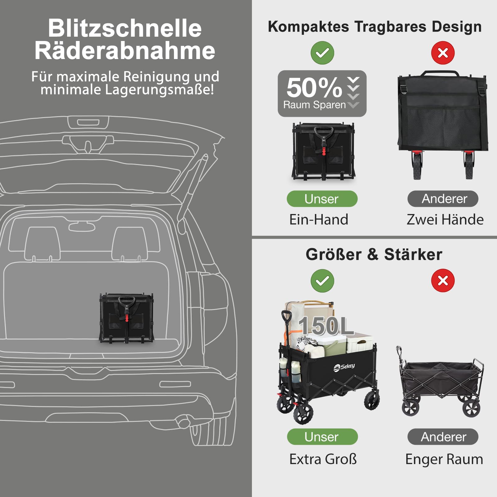 Der faltbare Bollerwagen von Sekey ist der ideale und robuste Begleiter für Familienausflüge, ob zum Strand, zum Einkaufen oder zum Campieren. Mit seinem grossen Ladevolumen und der hohen Tragkraft meistert er jede Herausforderung.