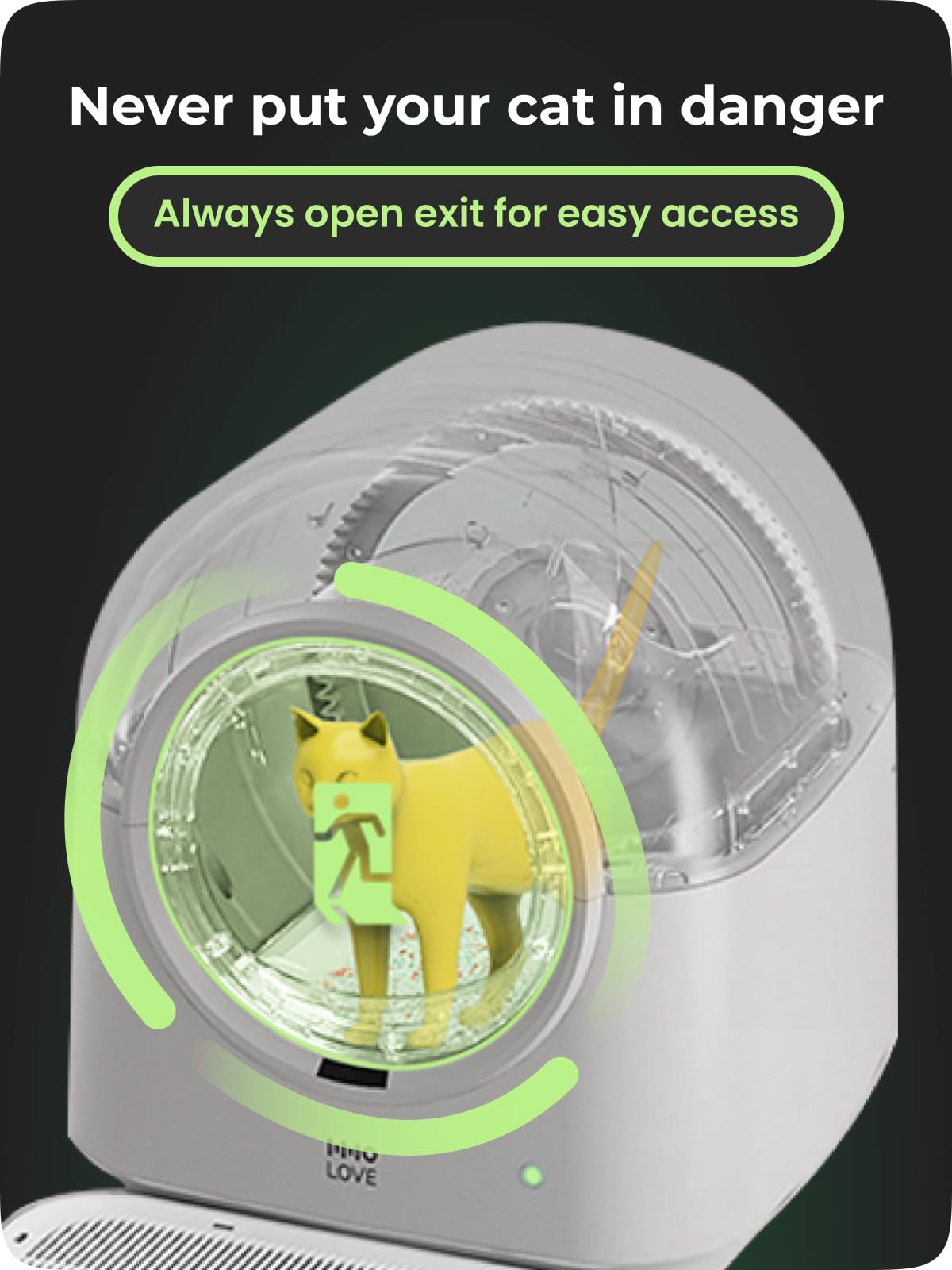Die Sicherheit hat oberste Priorität. Das Gerät verfügt über ein 100% einklemmsicheres Design und einen präzisen Schwerkraftsensor. Dieser Sensor erkennt, wann Ihre Katze die Toilette betritt oder verlässt, und stellt sicher, dass der Reinigungszyklus nur dann startet, wenn die Toilette leer ist.