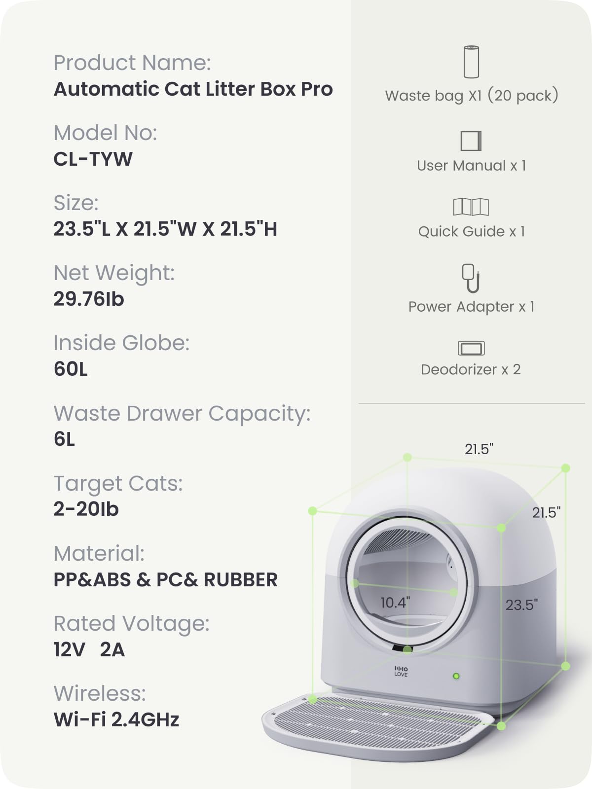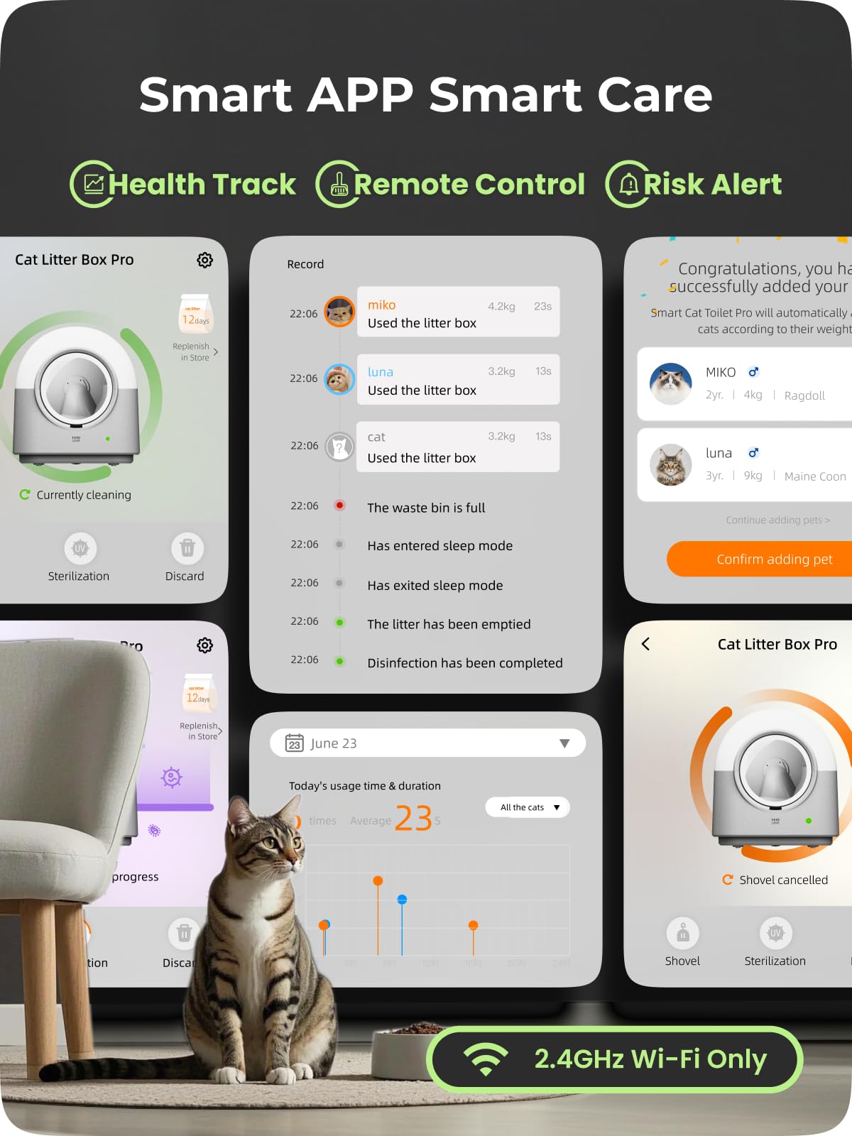 - Smarte App-Steuerung: Behalten Sie die Toilettengewohnheiten Ihrer Katze via Smartphone im Auge. Die App sendet Echtzeit-Benachrichtigungen und informiert, wann Streu oder der Abfallbeutel ersetzt werden müssen.
