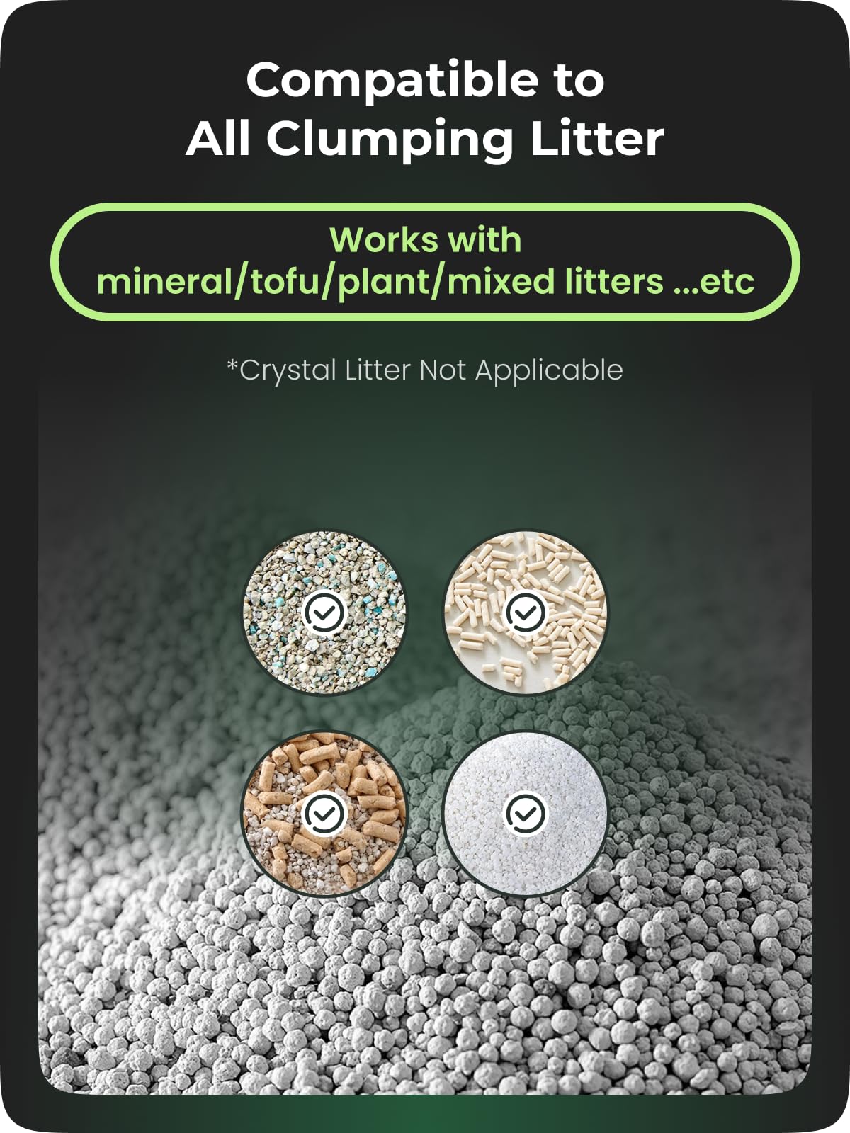 Für eine optimale Leistung des automatischen Siebsystems wird die Verwendung von hochwertigem, klumpendem Katzenstreu (z. B. auf Tonbasis) empfohlen. Dies stellt sicher, dass Abfallklumpen effizient getrennt werden können. Nicht-klumpendes Streu oder sehr grobes Streu könnte die Funktion beeinträchtigen.