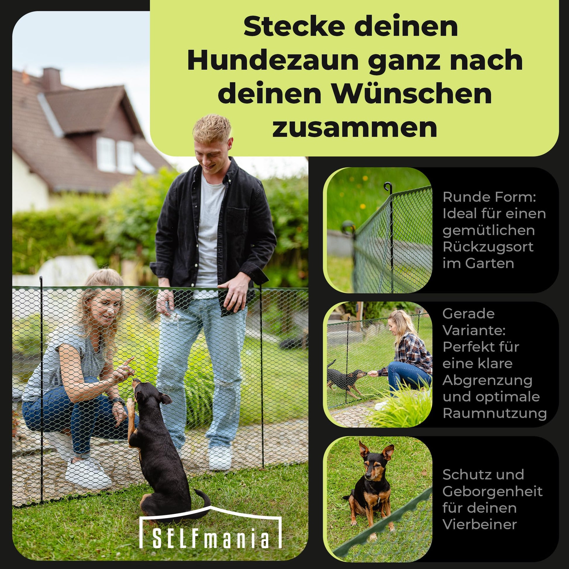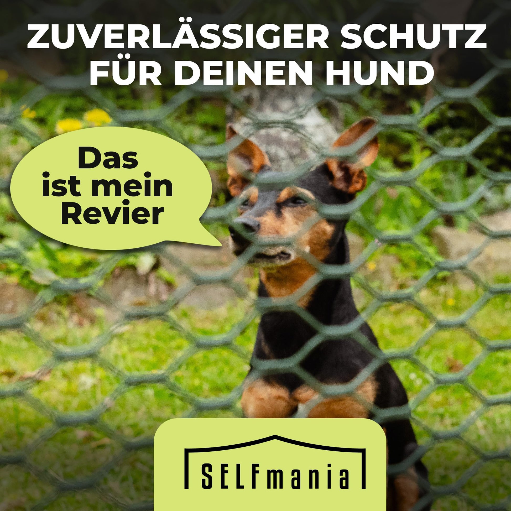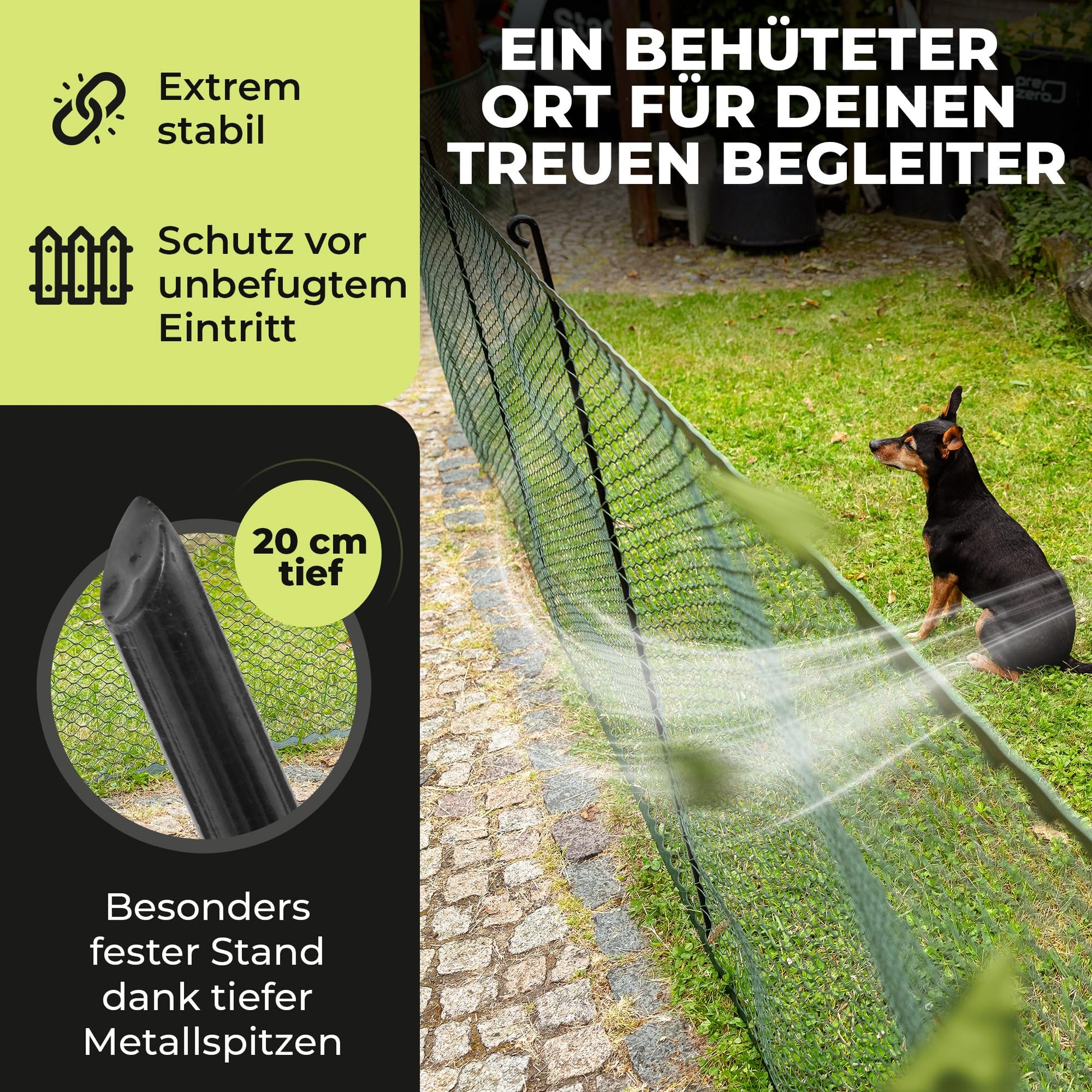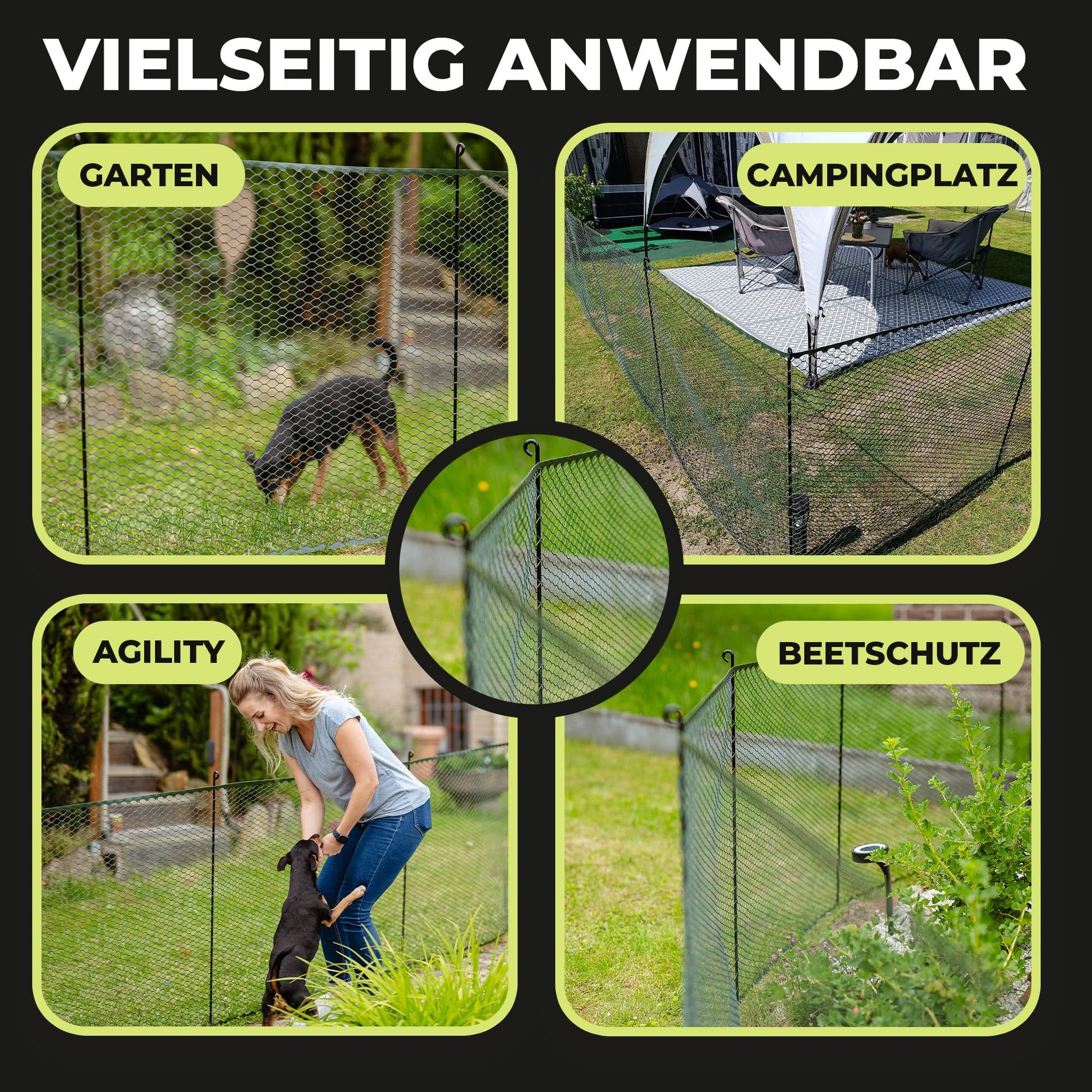 Der Zaun bietet mit einer Gesamtlänge von 25 Metern und einer Höhe von 90 cm einen grosszügigen Auslauf. Dank seines extrem engmaschigen Netzes ist er ideal für Hunde jeder Grösse und verhindert zuverlässig, dass auch kleine Hunde oder andere Kleintiere durchschlüpfen können.