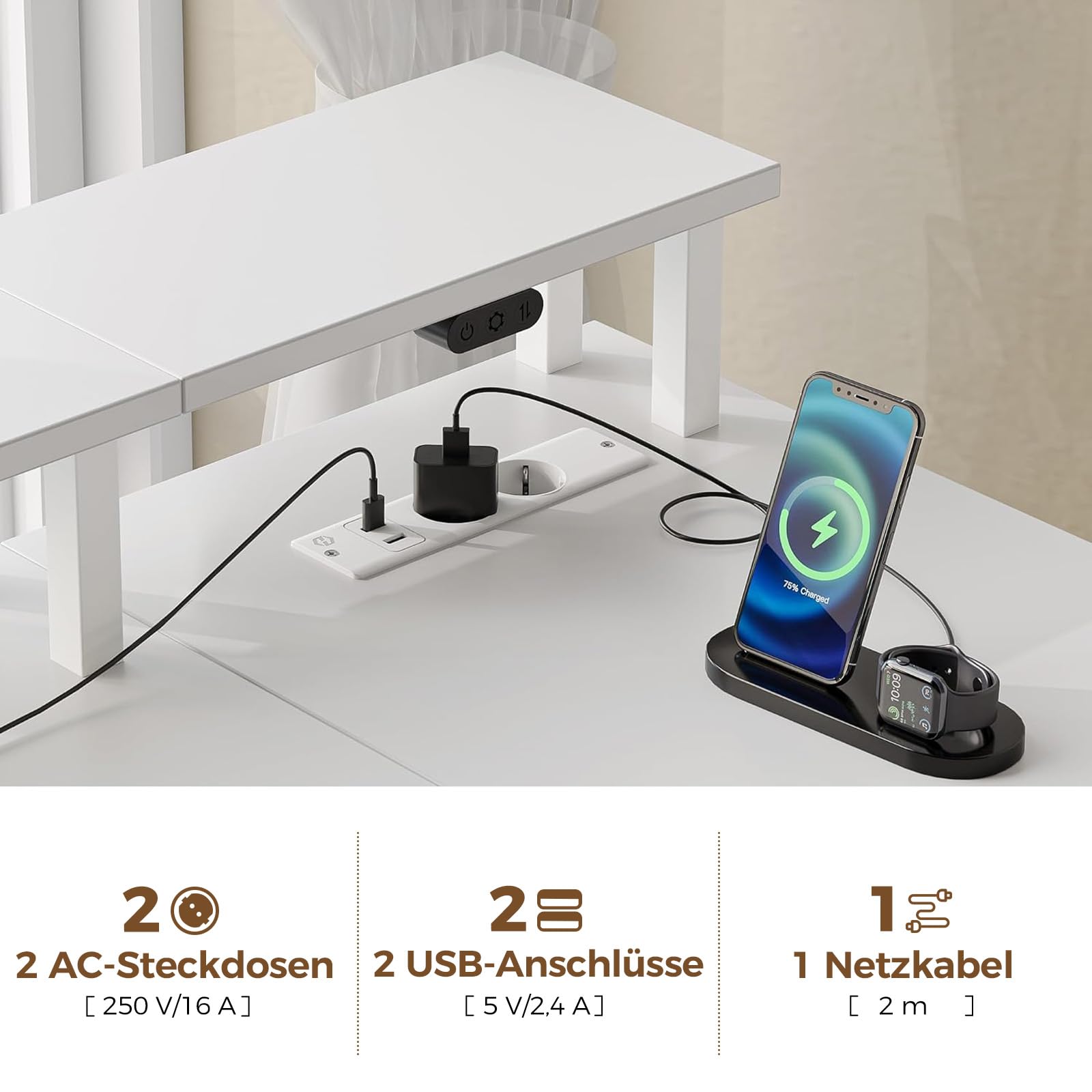 Die eingebaute Ladestation ist mit 2 Steckdosen und 2 USB-Anschlüssen ausgestattet. Damit können Sie Ihr Smartphone, Tablet und andere Geräte bequem direkt am Pult aufladen, ohne unter den Tisch kriechen zu müssen.