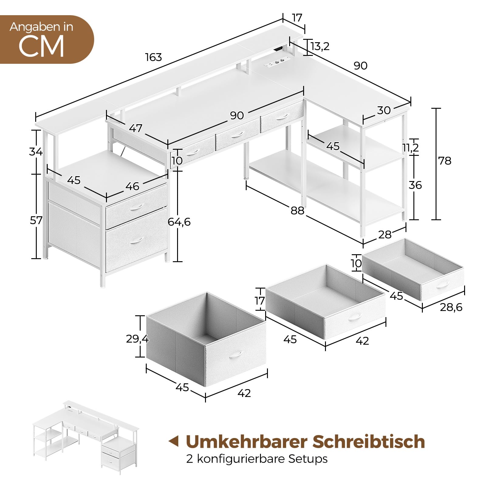 Ja, der L-förmige Schreibtisch hat ein reversibles Design. Sie können die lange und kurze Seite je nach Ihrer Raumecke und Ihren Bedürfnissen flexibel montieren, was maximale Flexibilität bei der Einrichtung ermöglicht.