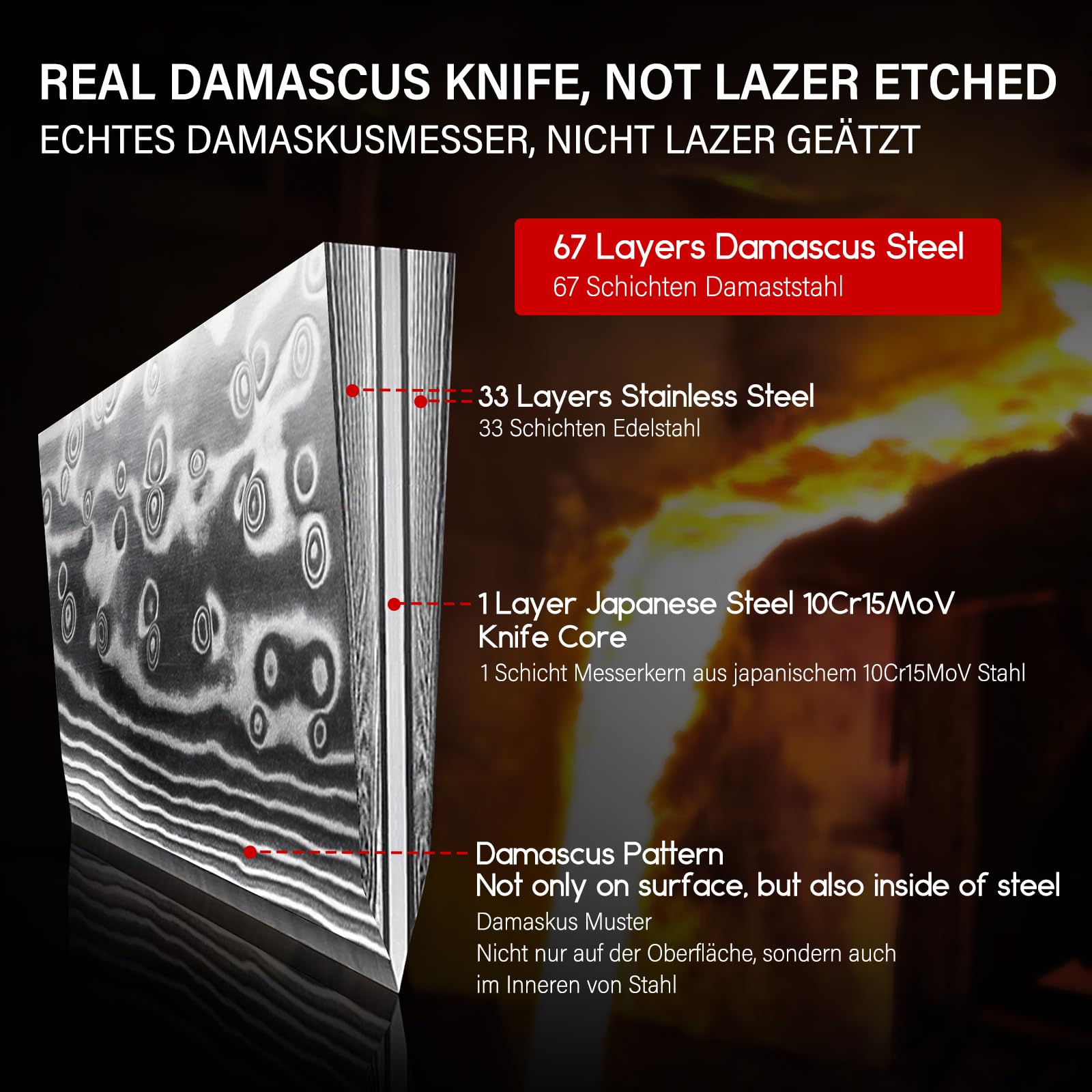 - Klingenaufbau: Authentische Damast-Optik durch 67 kunstvoll gefaltete und geschmiedete Stahllagen.