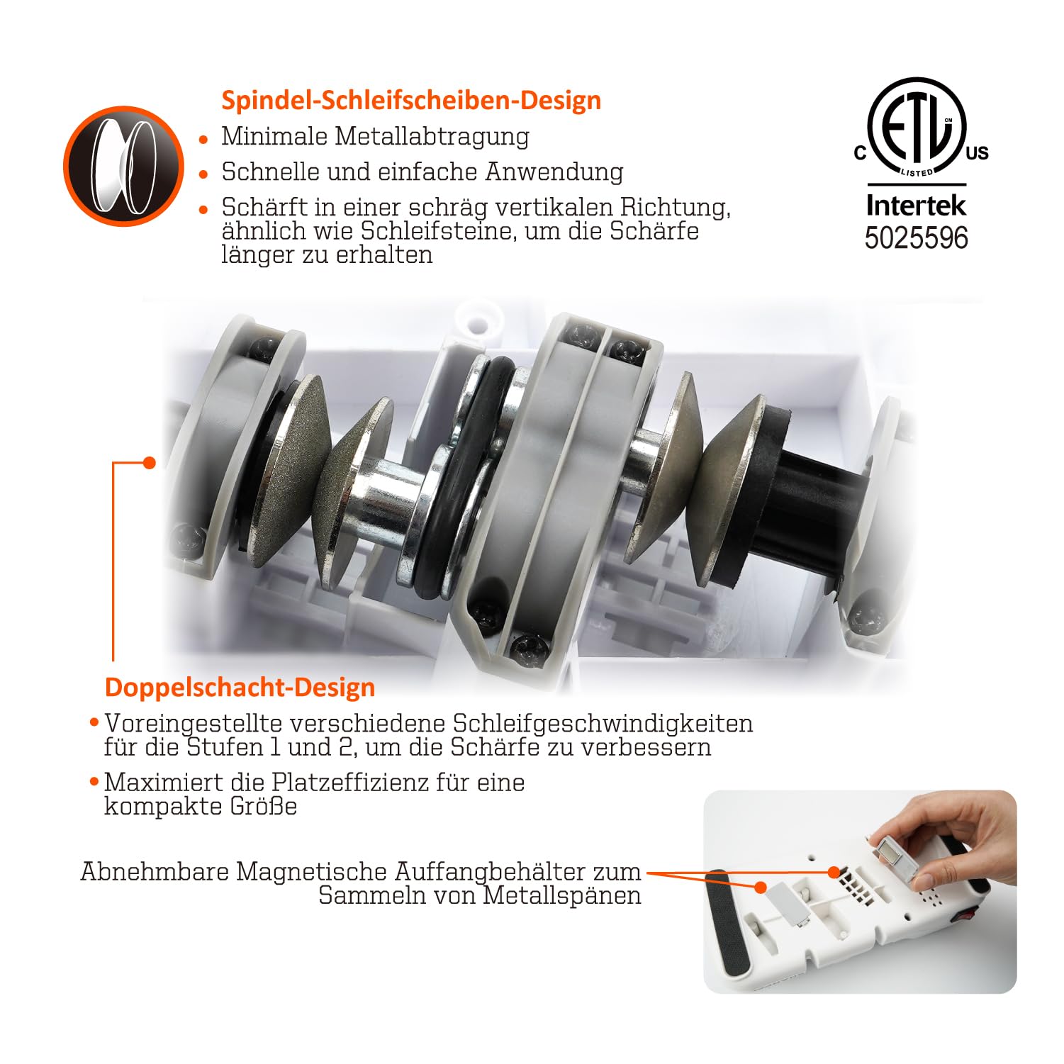 - Innovativer Doppelwellen-Antrieb: Optimierte Geschwindigkeiten für jede Schärfstufe – langsamer beim Grobschliff, schneller beim Feinschliff.