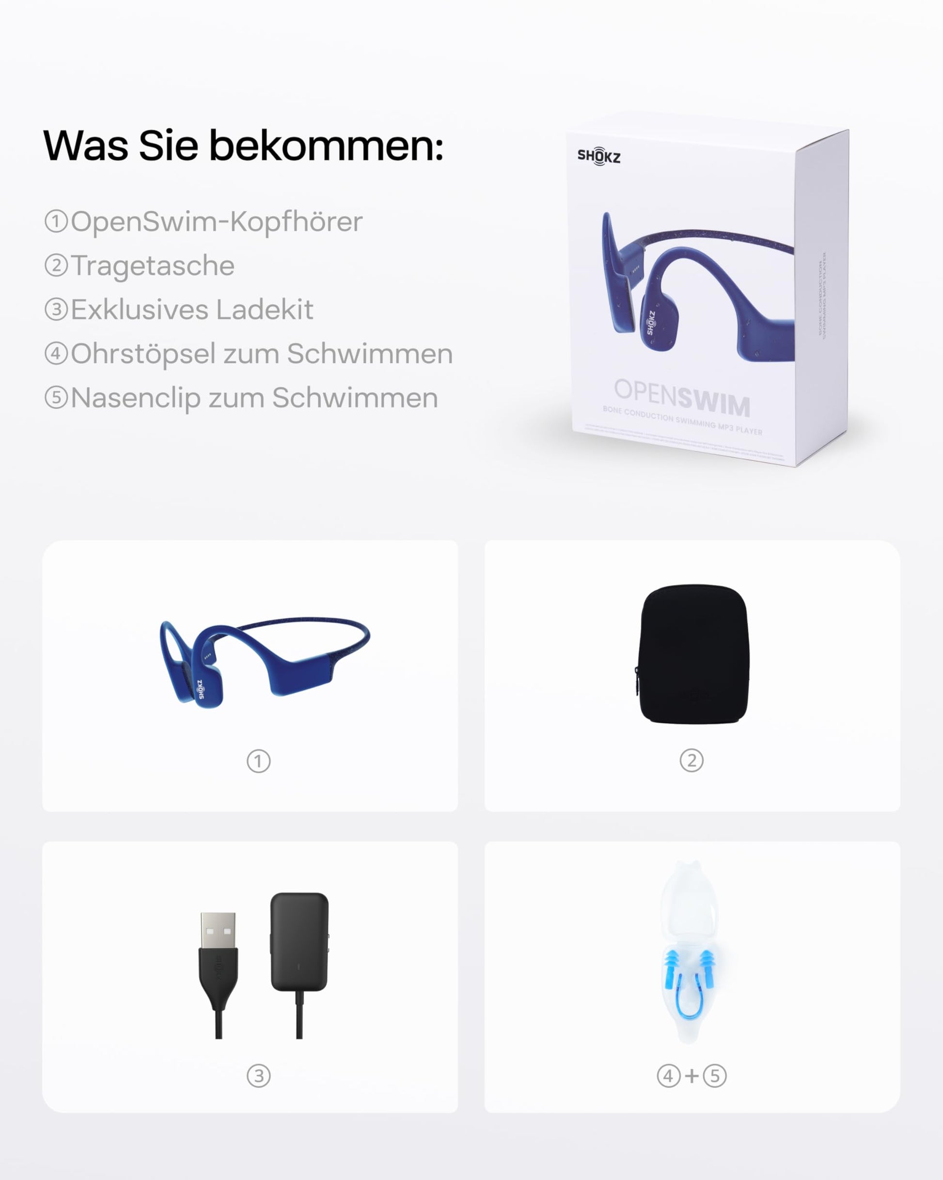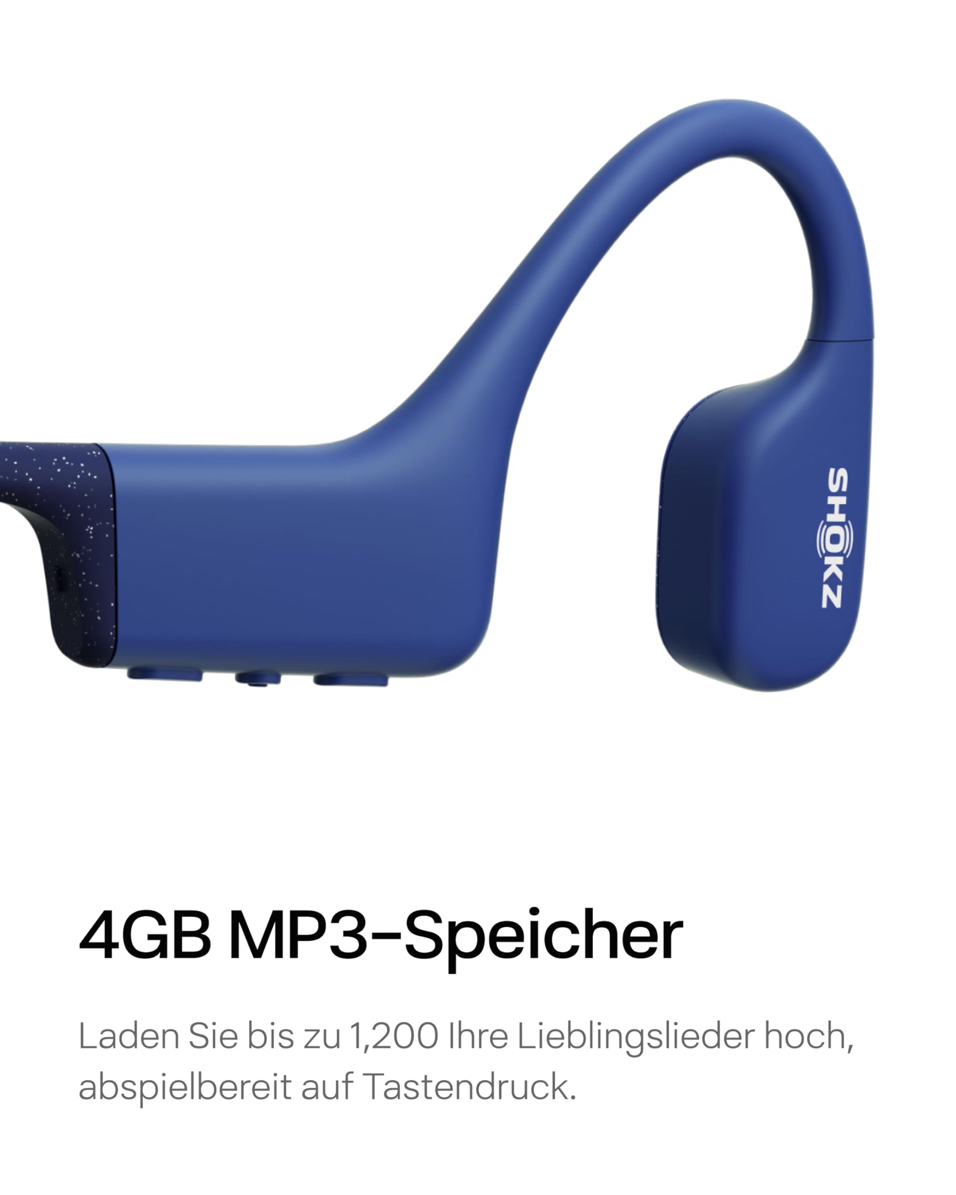 - Integrierter MP3-Player: Mit 4 GB internem Speicher bietet der OpenSwim Platz für bis zu 1200 Songs und funktioniert komplett ohne Bluetooth-Verbindung.
