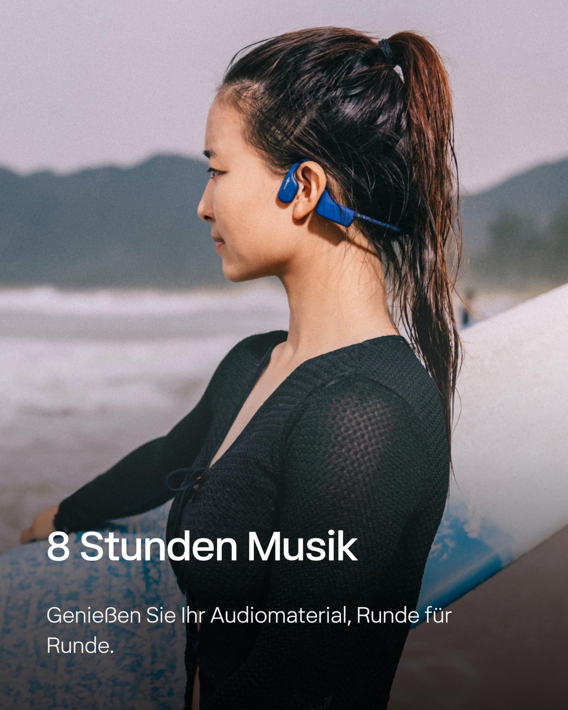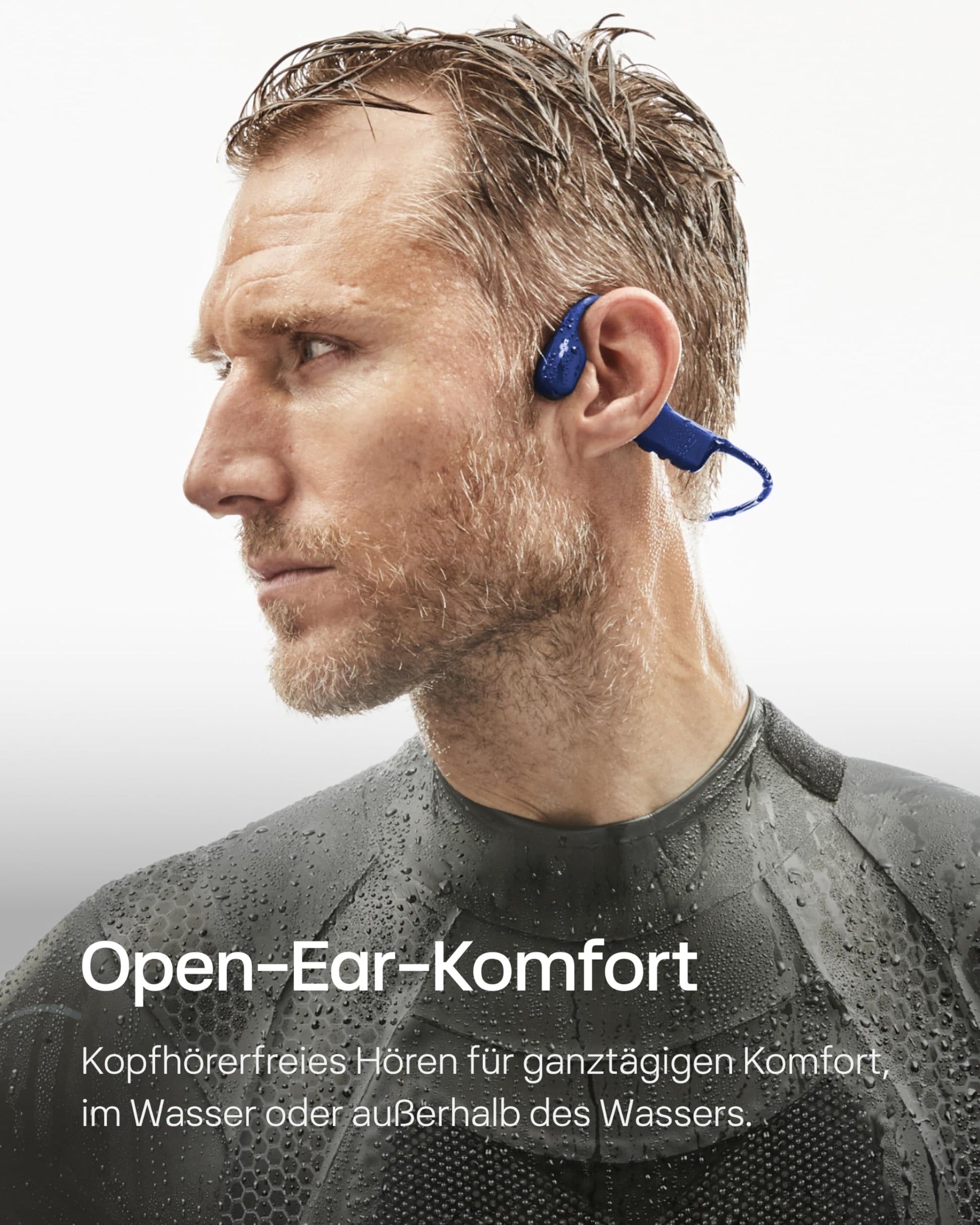 Erleben Sie mit dem Open-Ear-Design einen unvergleichlichen Komfort. Da die Kopfhörer nicht in die Ohren gesteckt werden, entsteht kein unangenehmer Druck und Sie nehmen Ihre Umgebung weiterhin wahr – für mehr Sicherheit beim Laufen oder Velofahren. Das stöpselfreie Erlebnis ist sowohl im als auch ausserhalb des Wassers äusserst angenehm.