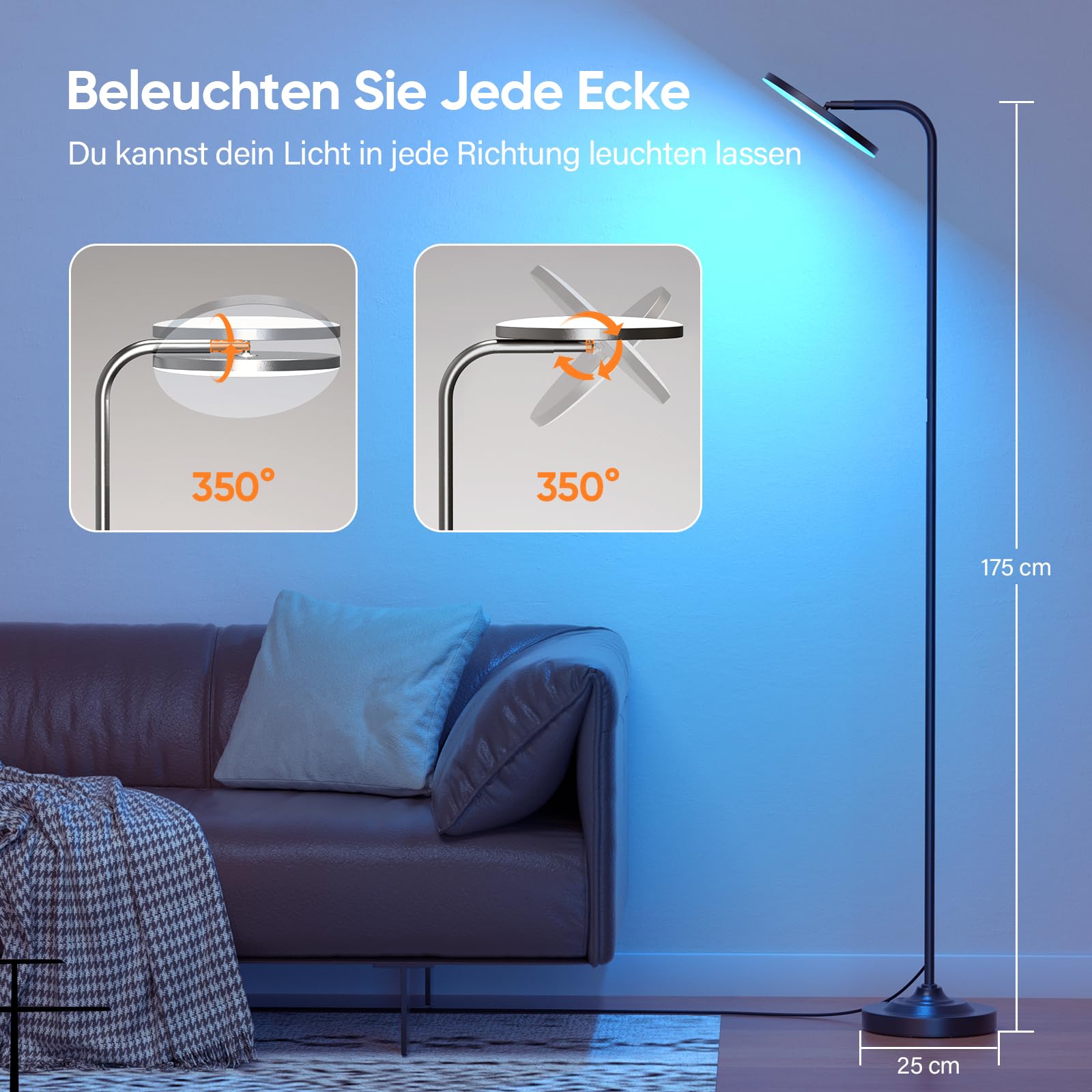 Gezielte und umfassende Ausleuchtung. Dank der starken Leistung und des flexibel schwenkbaren Leuchtkopfs dient diese Stehleuchte sowohl als kraftvoller Deckenfluter, der den gesamten Raum erhellt, als auch als fokussierte Leselampe neben Ihrem Sessel. Die Beleuchtung passt sich Ihren Bedürfnissen an, nicht umgekehrt.