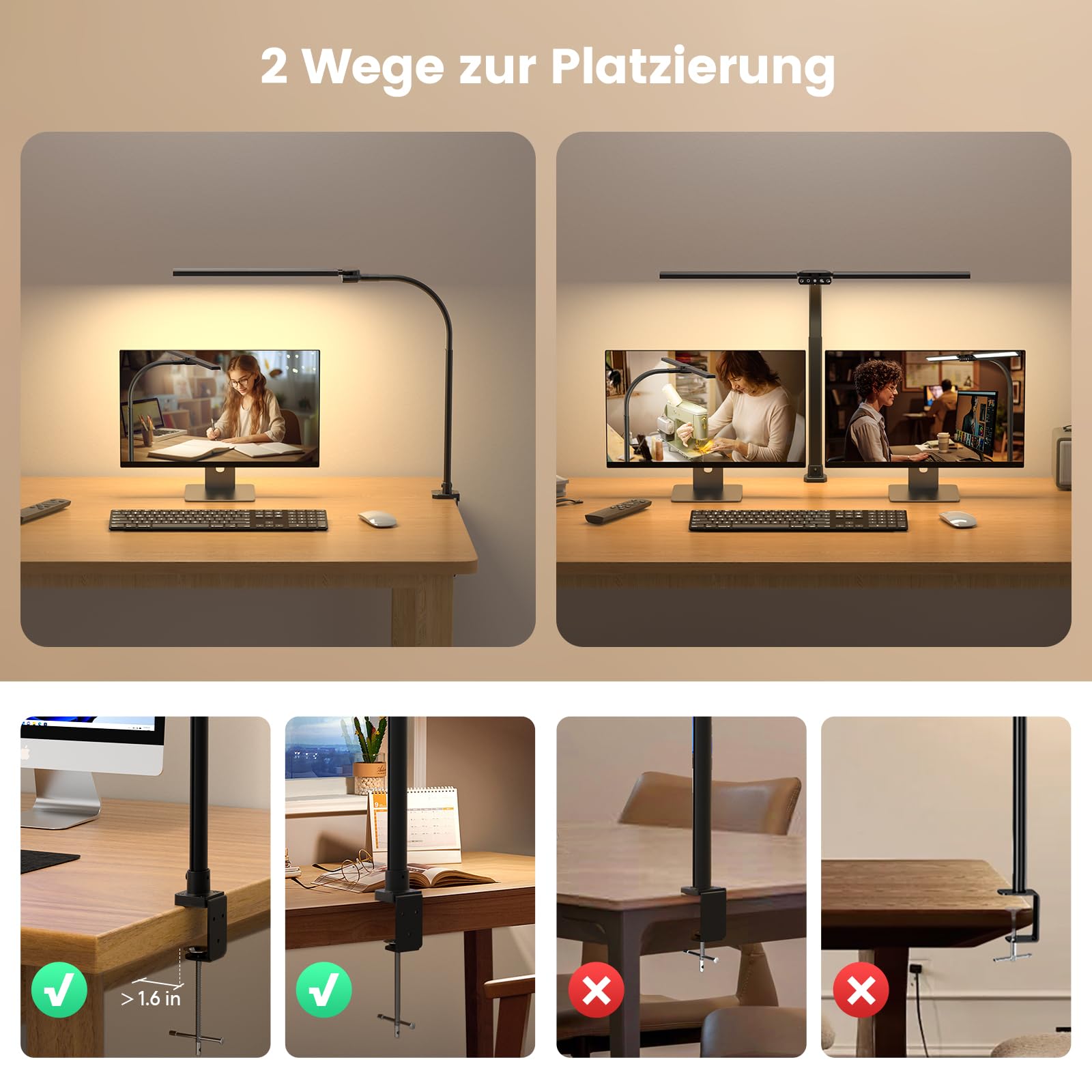 Mit ihrem einzigartigen Doppelkopf-Design und dem flexiblen Schwanenhals leuchtet diese Schreibtischlampe Ihren Arbeitsbereich grossflächig und schattenfrei aus. Sie ist die perfekte Lösung für breite Schreibtische, Zeichentische oder ein Setup mit mehreren Monitoren, wo eine herkömmliche Lampe nicht ausreicht.