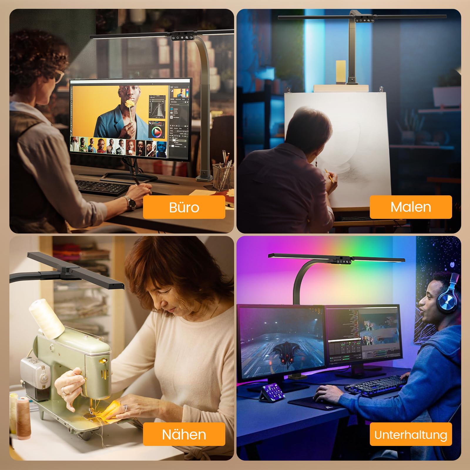 Entdecken Sie die ultimative Flexibilität für Ihren Schreibtisch mit dieser innovativen Doppelkopf-LED-Lampe. Sie vereint helles, funktionales Arbeitslicht mit einer dynamischen RGB-Beleuchtung und passt sich so mühelos jeder Aufgabe und Stimmung an.