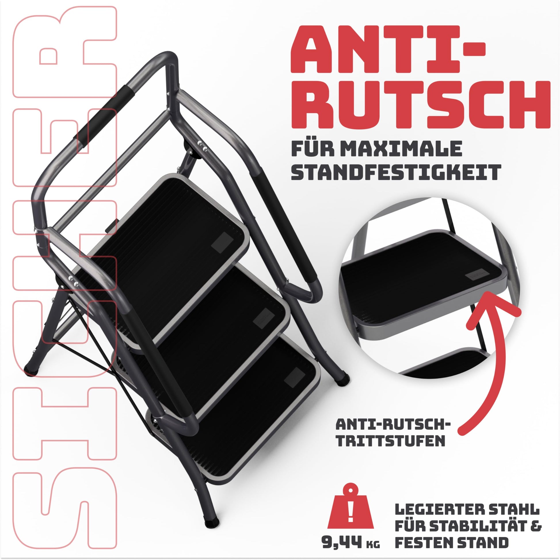 - Rutschfeste Stufen: Jede der drei Trittstufen ist mit einer Anti-Rutsch-Oberfläche versehen, um die Sicherheit weiter zu erhöhen.